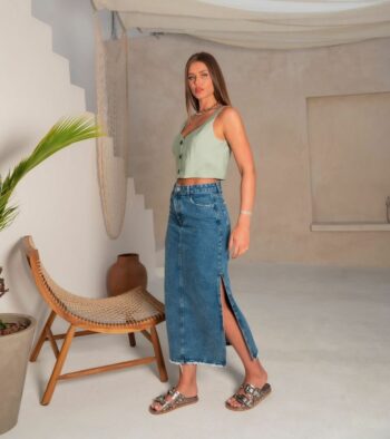 Saia Jeans Midi Abertura Lateral Barra Desfiada