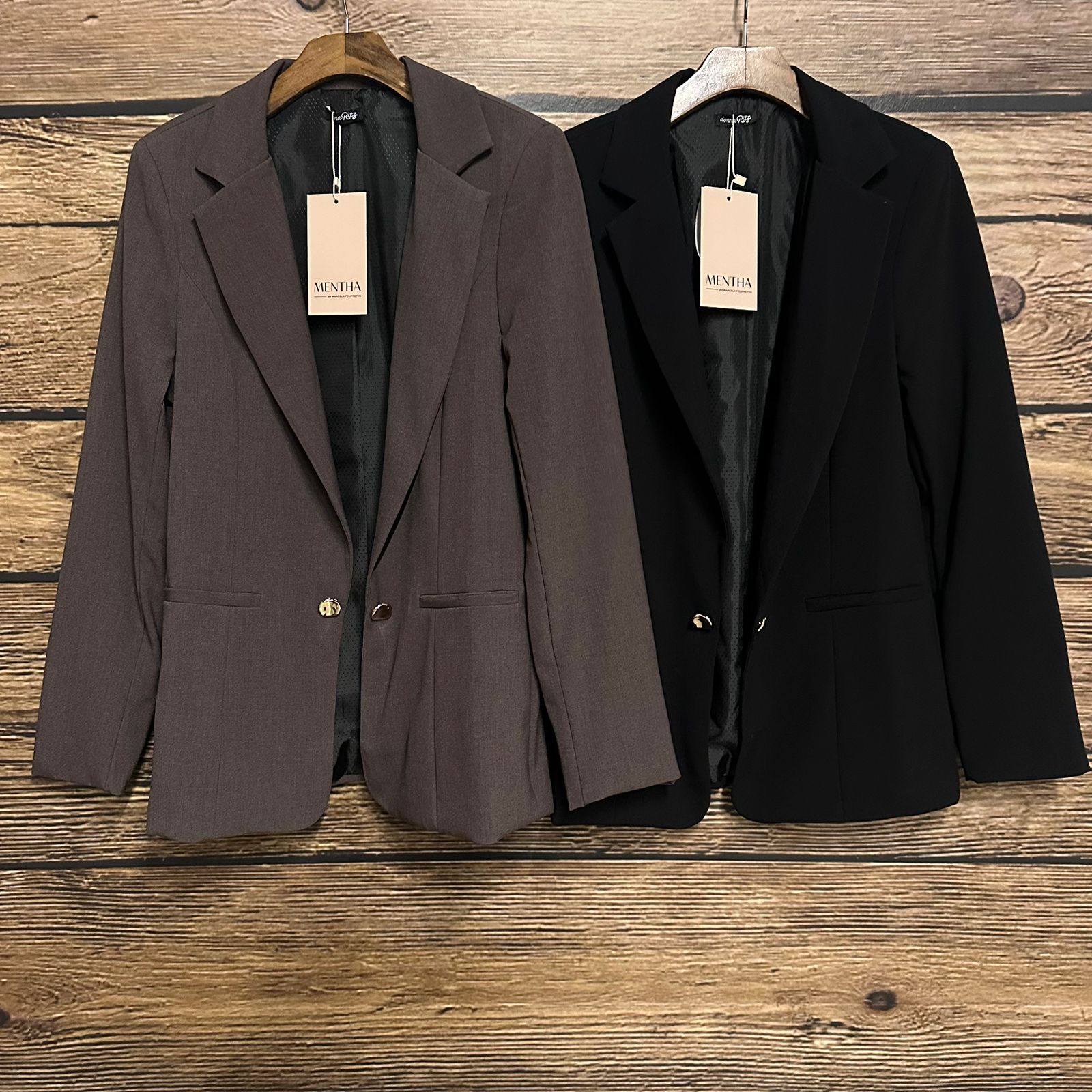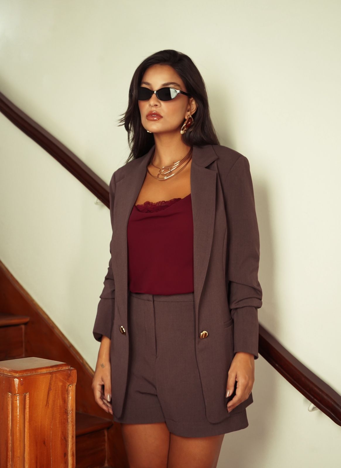 Blazer boy em alfaiataria mista de viscose com elastano. Possui ombreira, bolso vivo, botão de metal orgânico e forro.