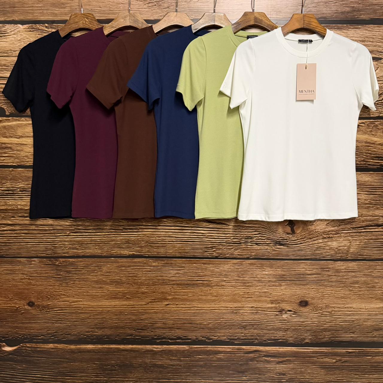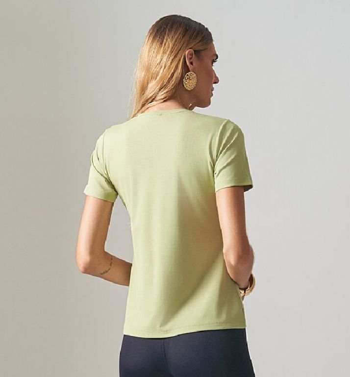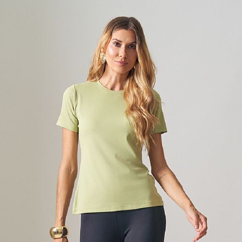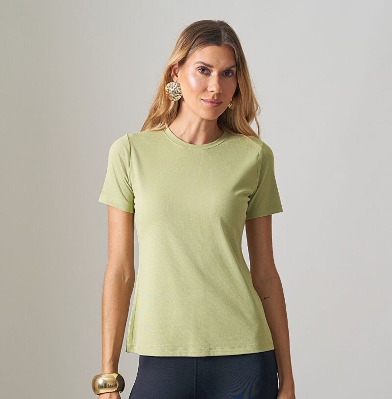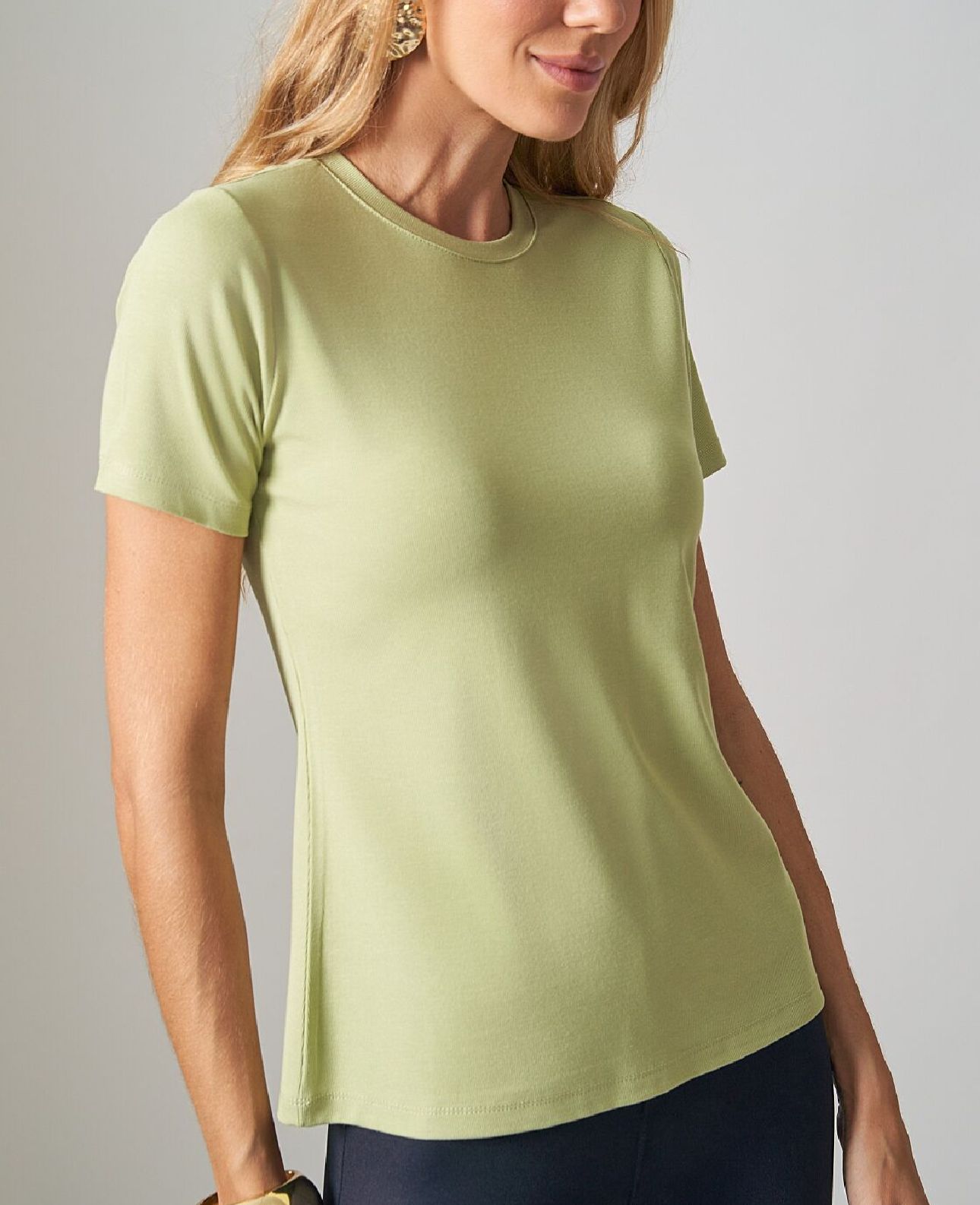Blusa básica com decote redondo, manga curta solta e acabamento na galoneira.