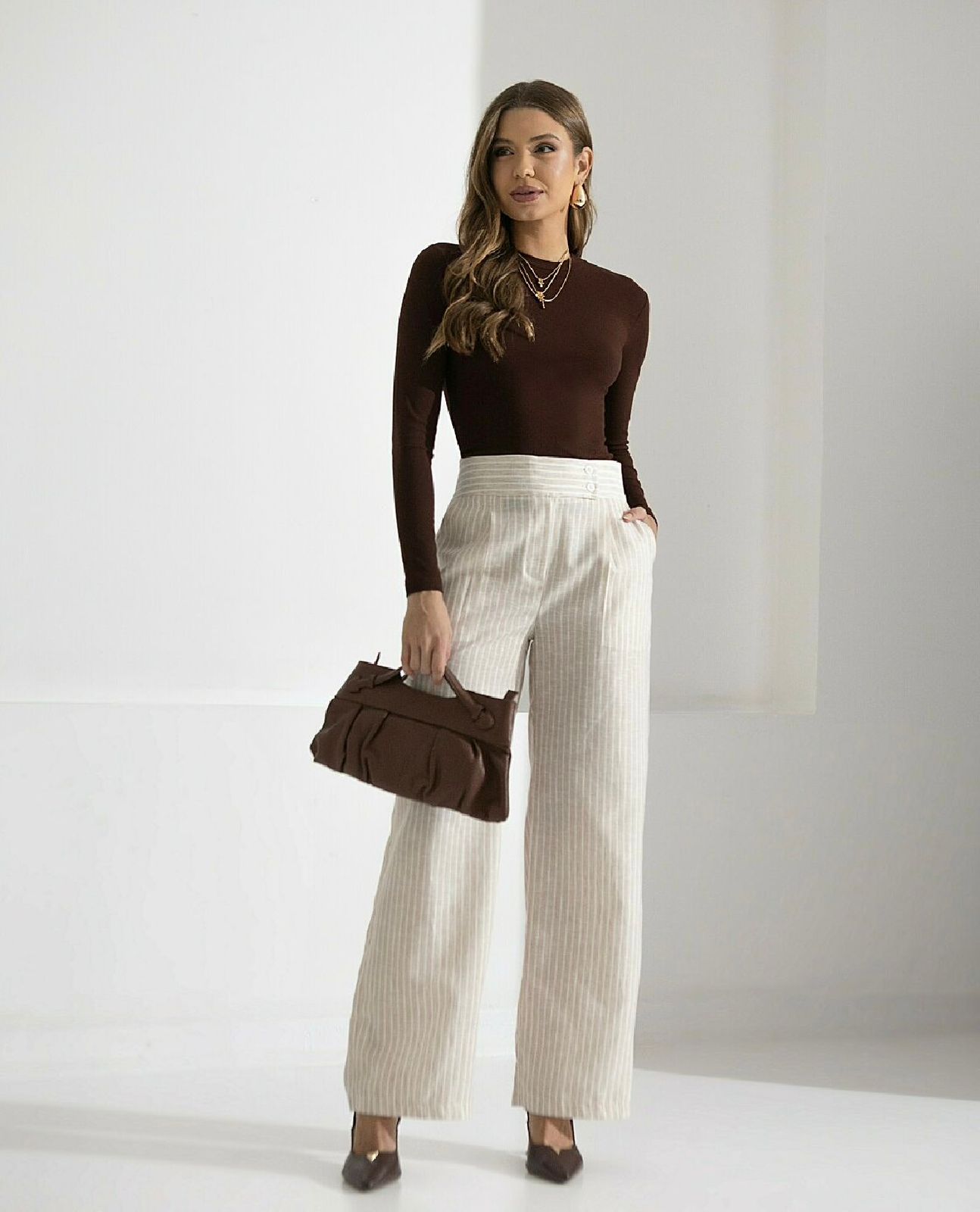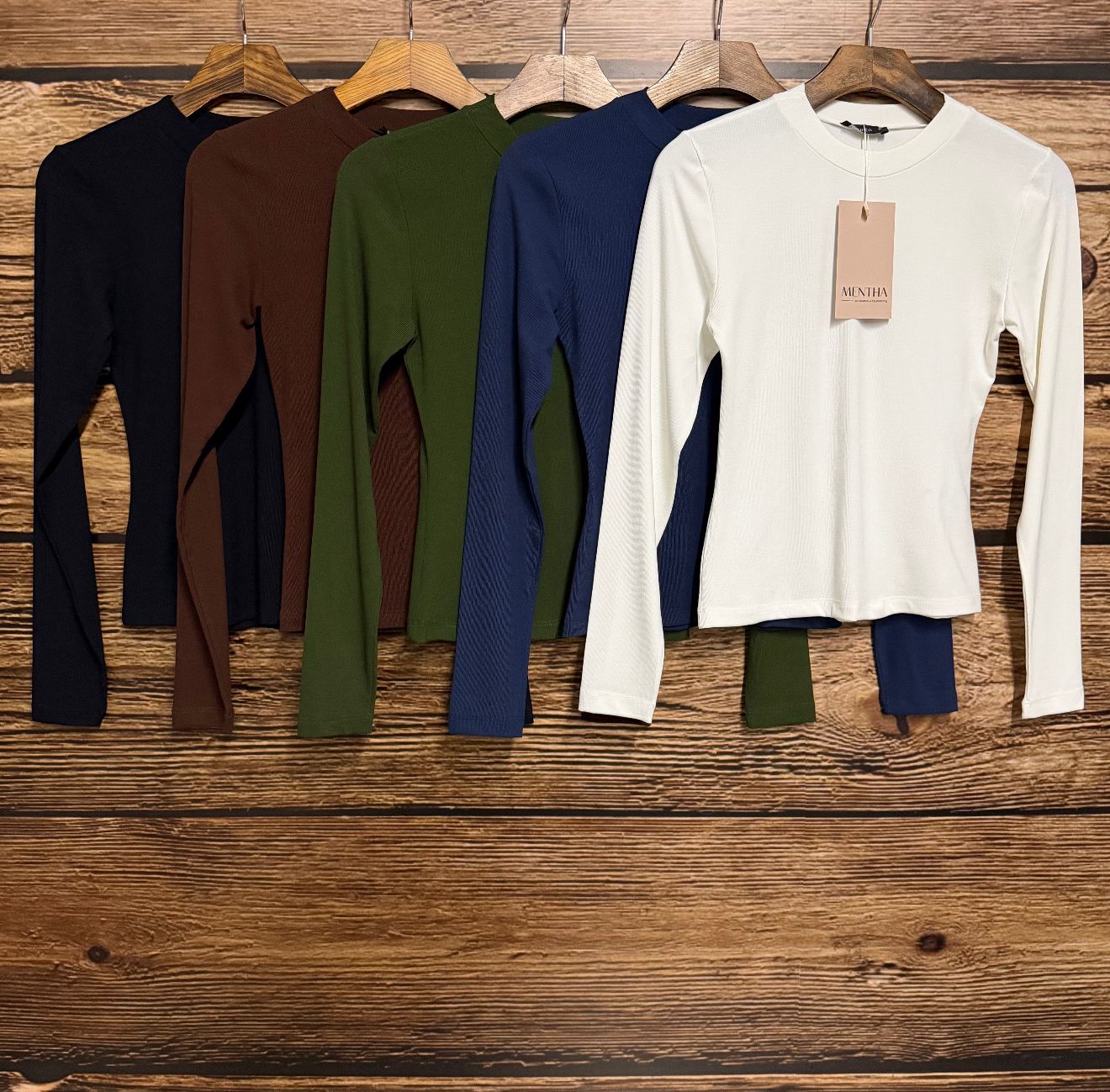 Blusa com decote de punho mais largo, mais juntinha e acabamento galoneira.