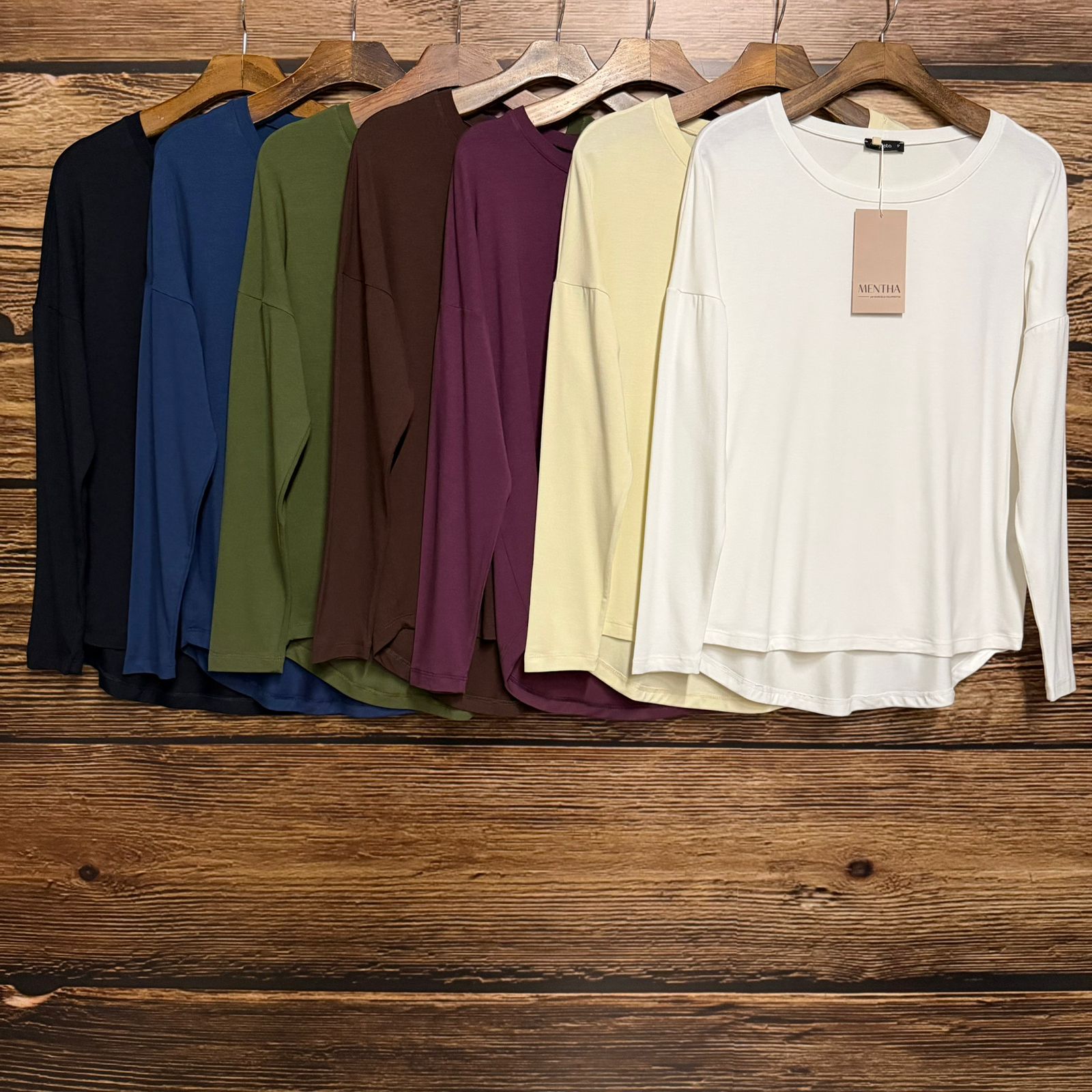 Blusa Básica Viscolycra com Manga Longa com Cava Deslocada, Decote Redondo e Detalhe das Costas Abaulada.