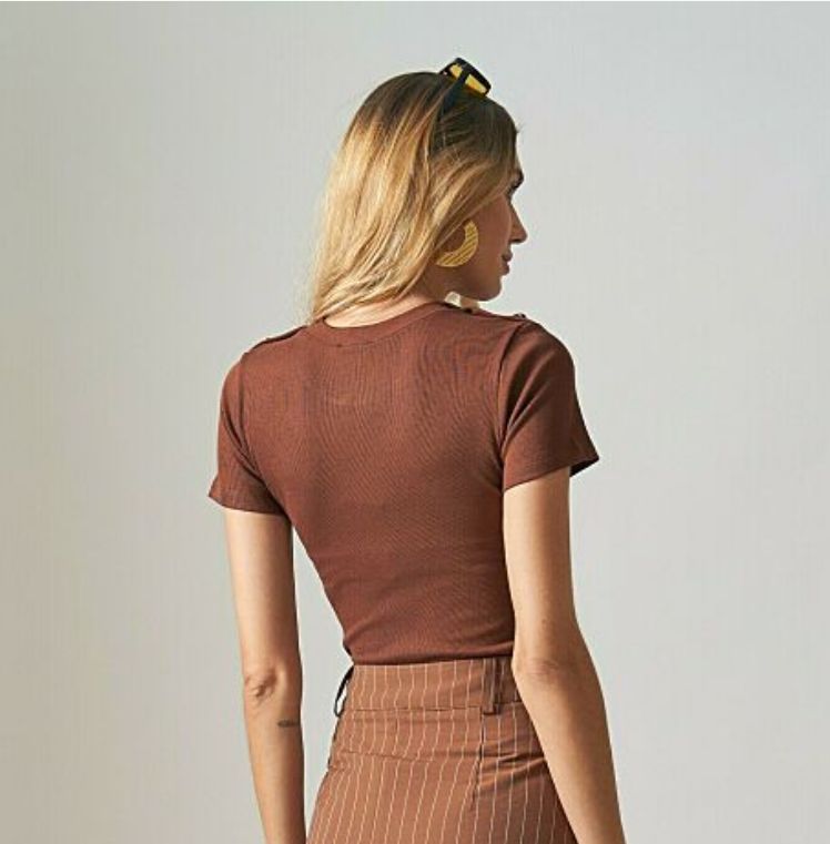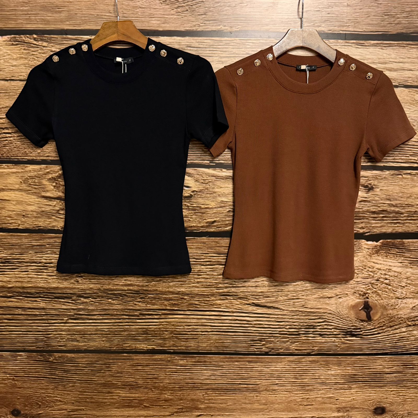 Blusa manga curta canelada com 6 botões nos ombros e acabamento na galoneira.