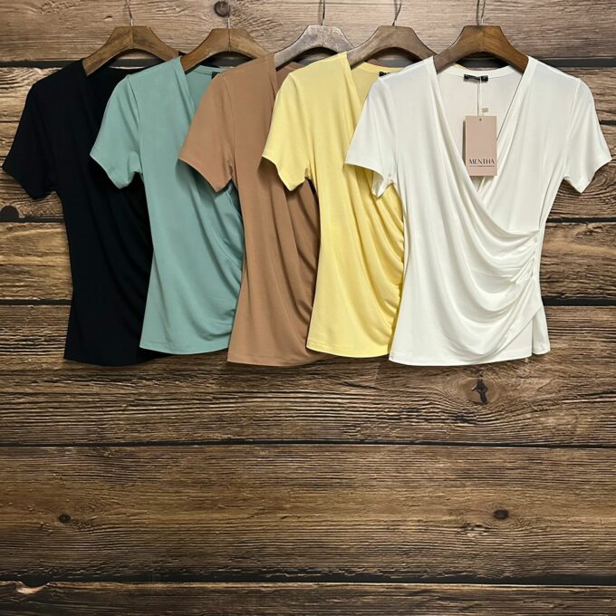 Blusa visco decote V transpassada com pregas e acabamento na galoneira.