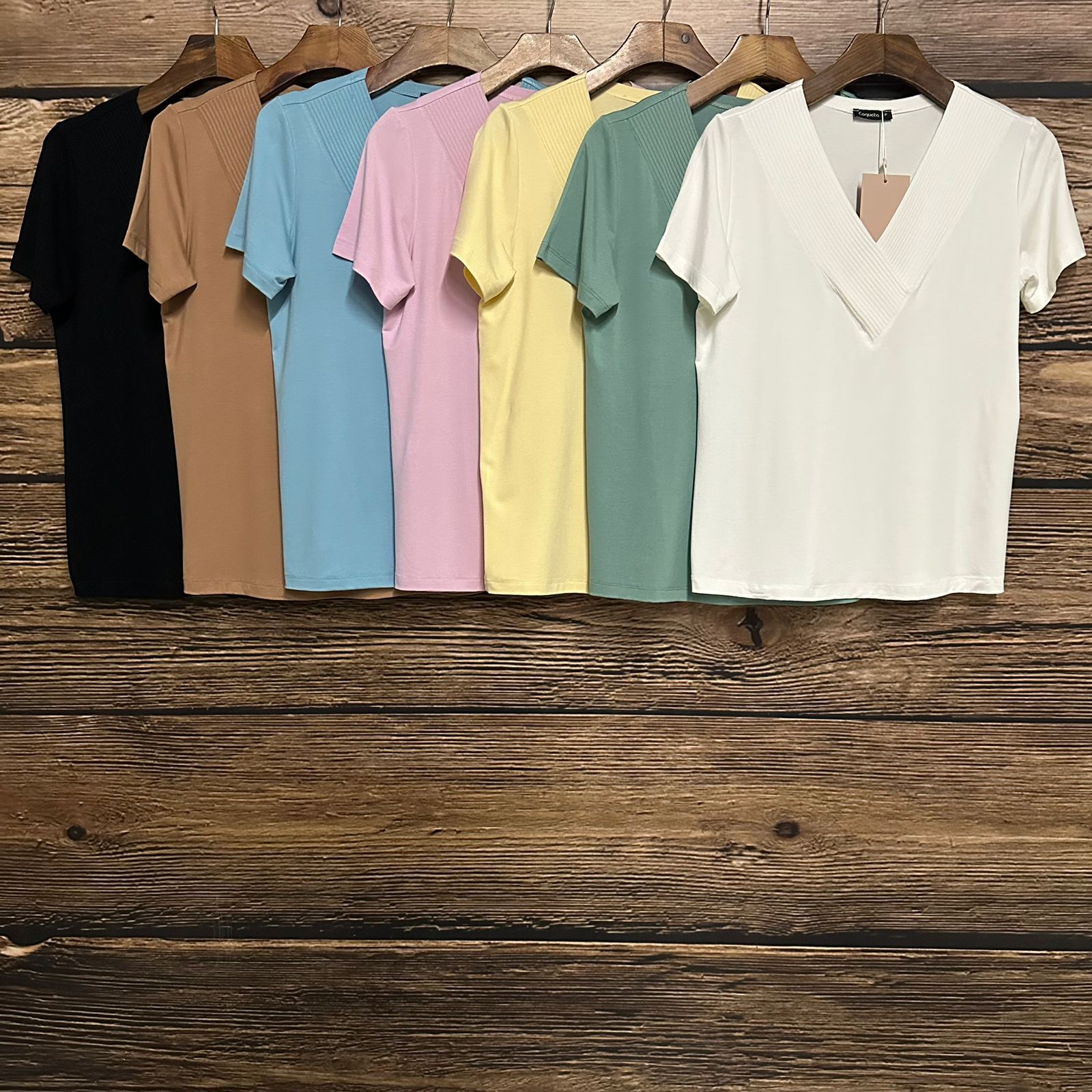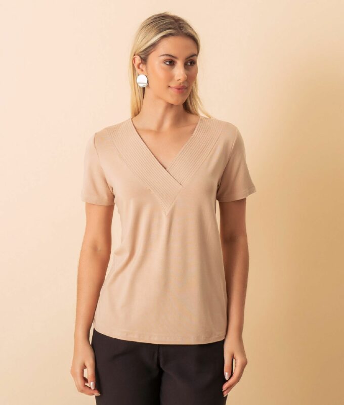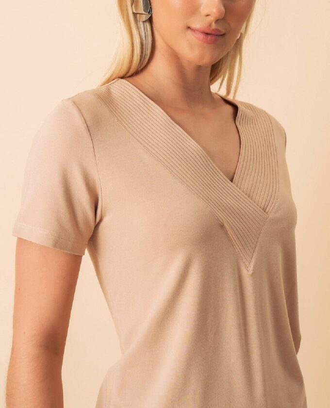 Blusa Básica Viscolycra com Manga Curta e Decote em V no Canelado Transpassado.