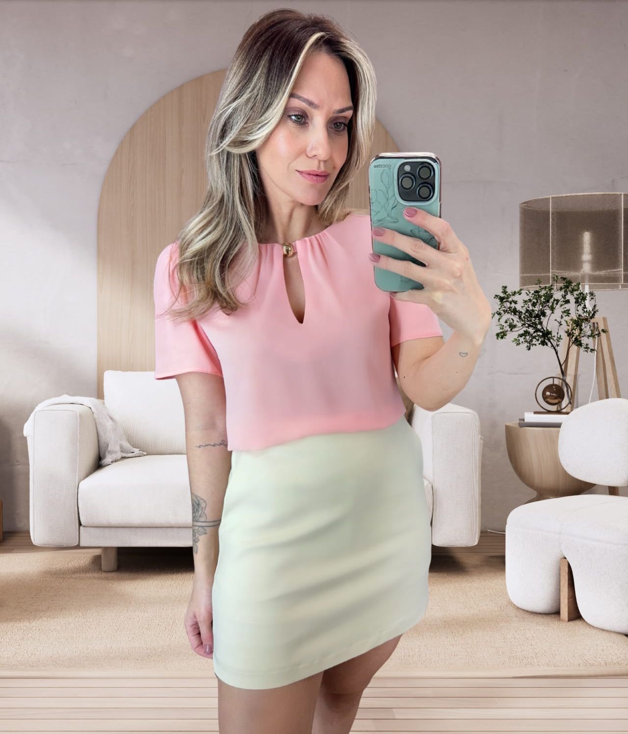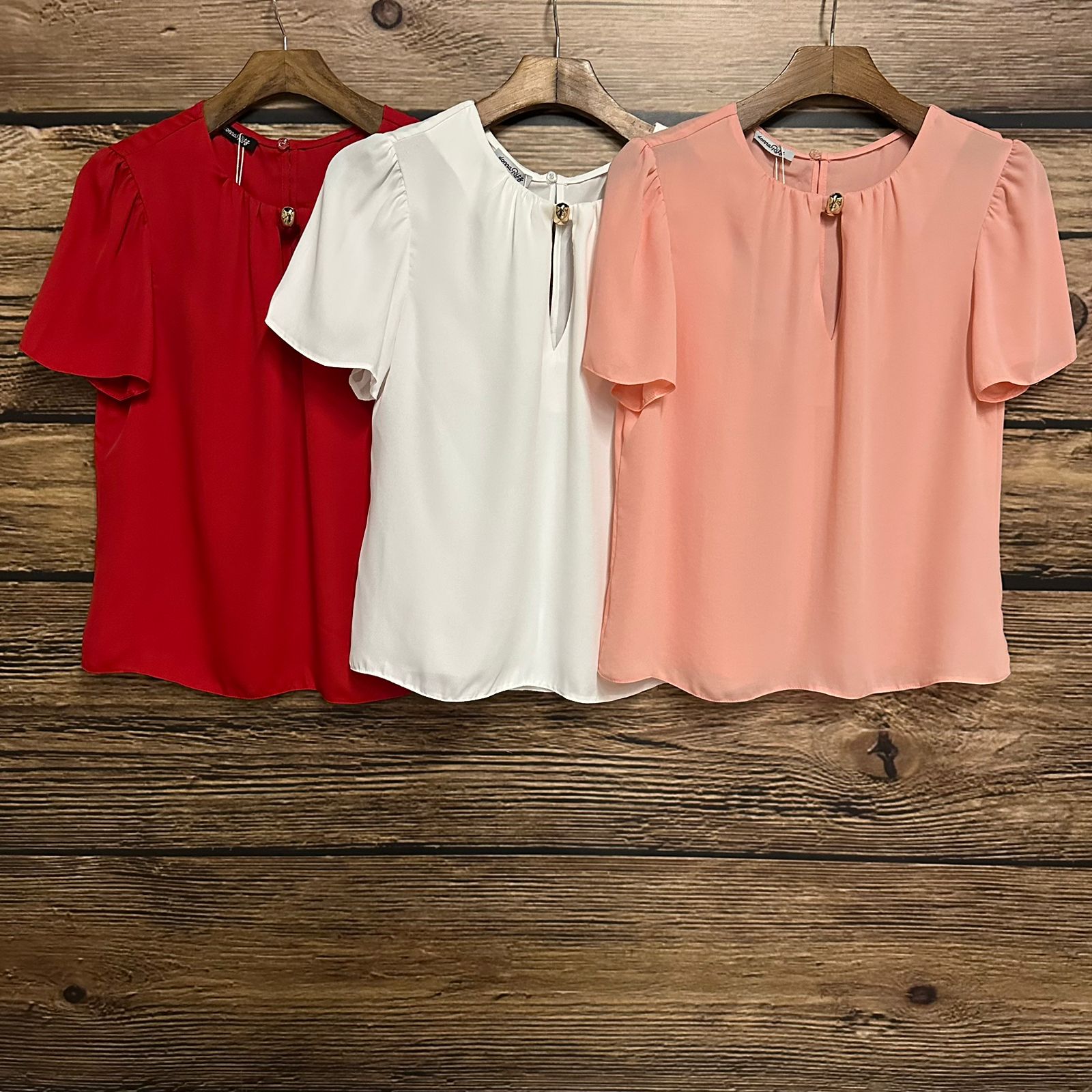 Blusa em crepe liso. Possui decote vazado com aviamento de metal, franzido localizado e fechamento em botão nas costas.