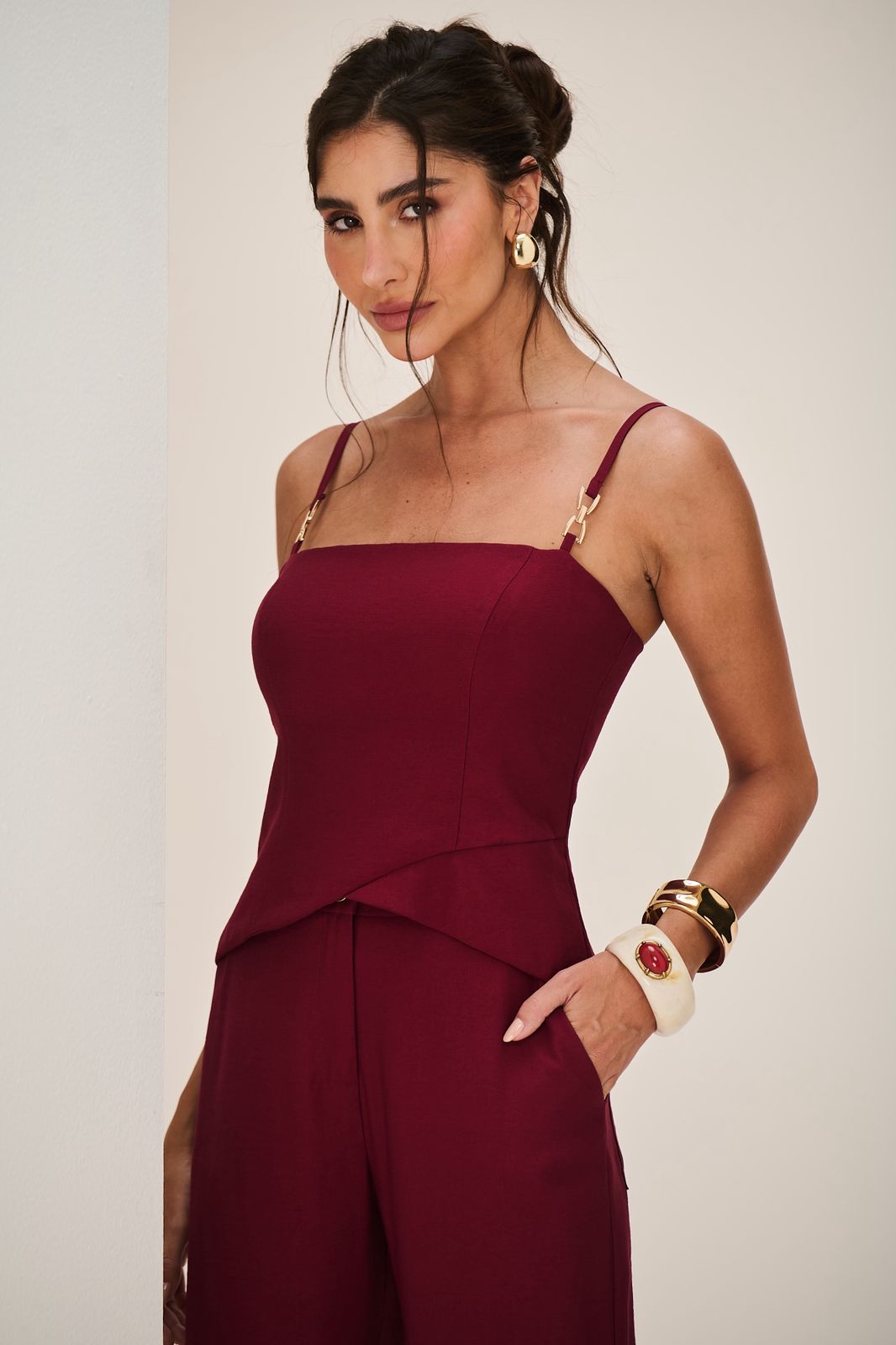 Alfaiataria poliviscose encorpada e macia Barra assimétrica com recorte moderno Alças finas com detalhe metálico Caimento estruturado que valoriza o corpo