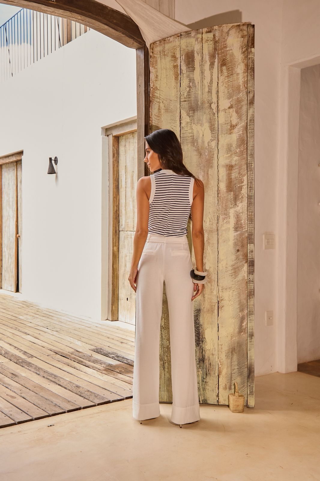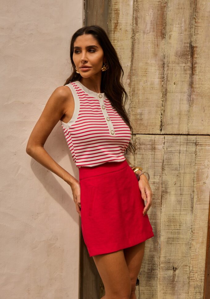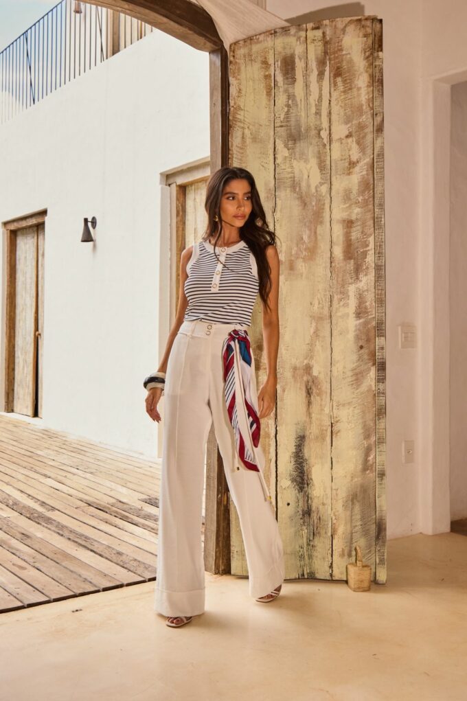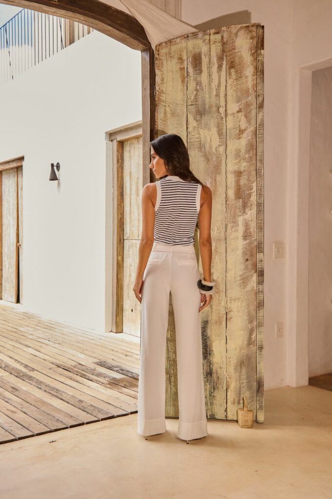 Acabamento em retilínea branca no decote e cavas