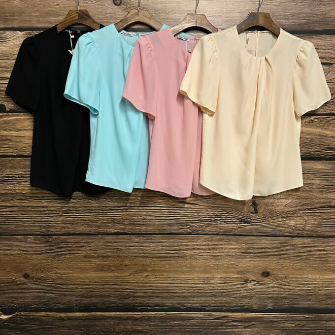 Blusa em crepe liso com pregas na gola e fechamento nas costas em botão.