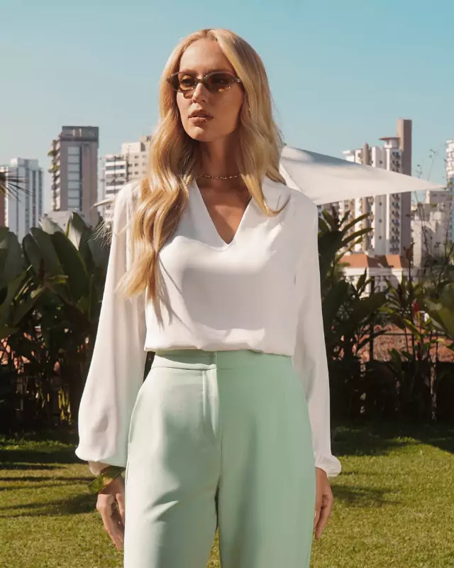 Blusa em crepe liso. Possui pregas no ombro e elástico no punho.
