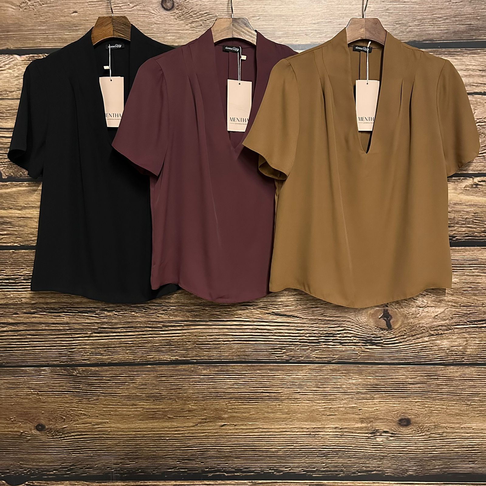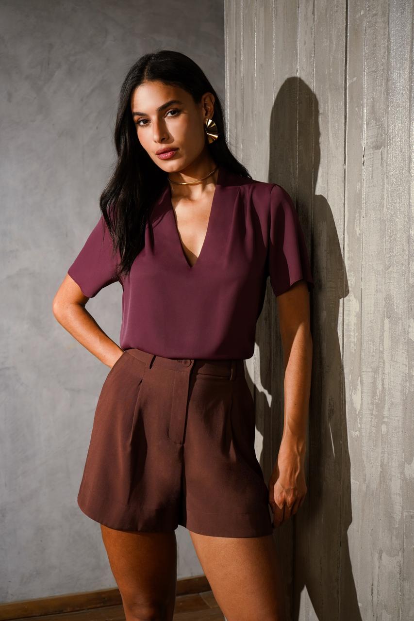 Blusa em crepe liso com decote em V e pregas no ombro.