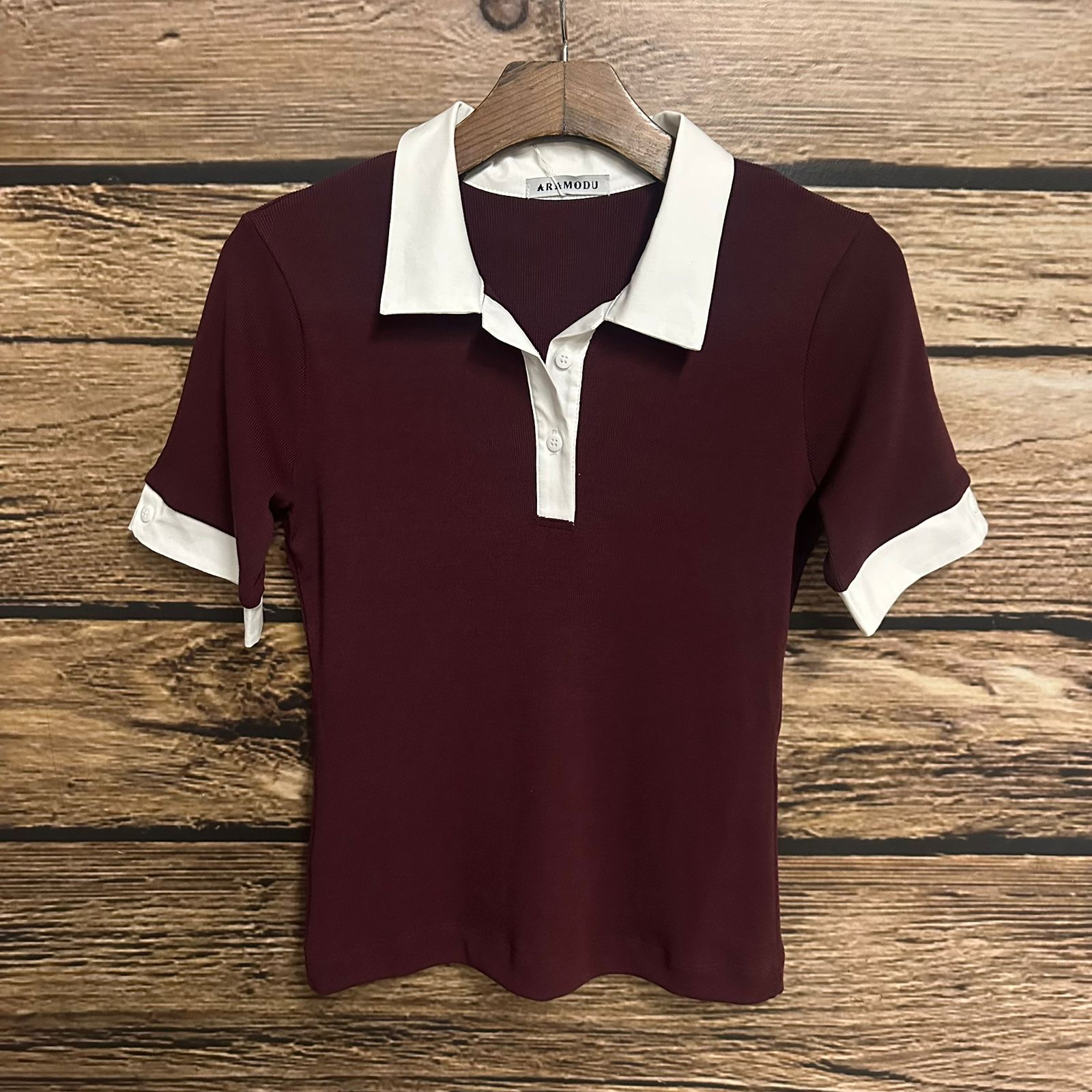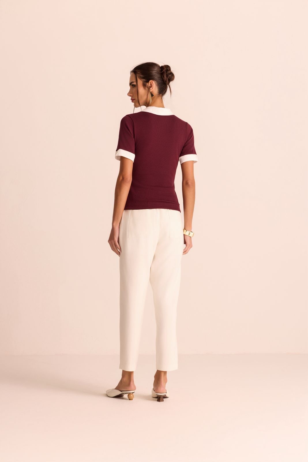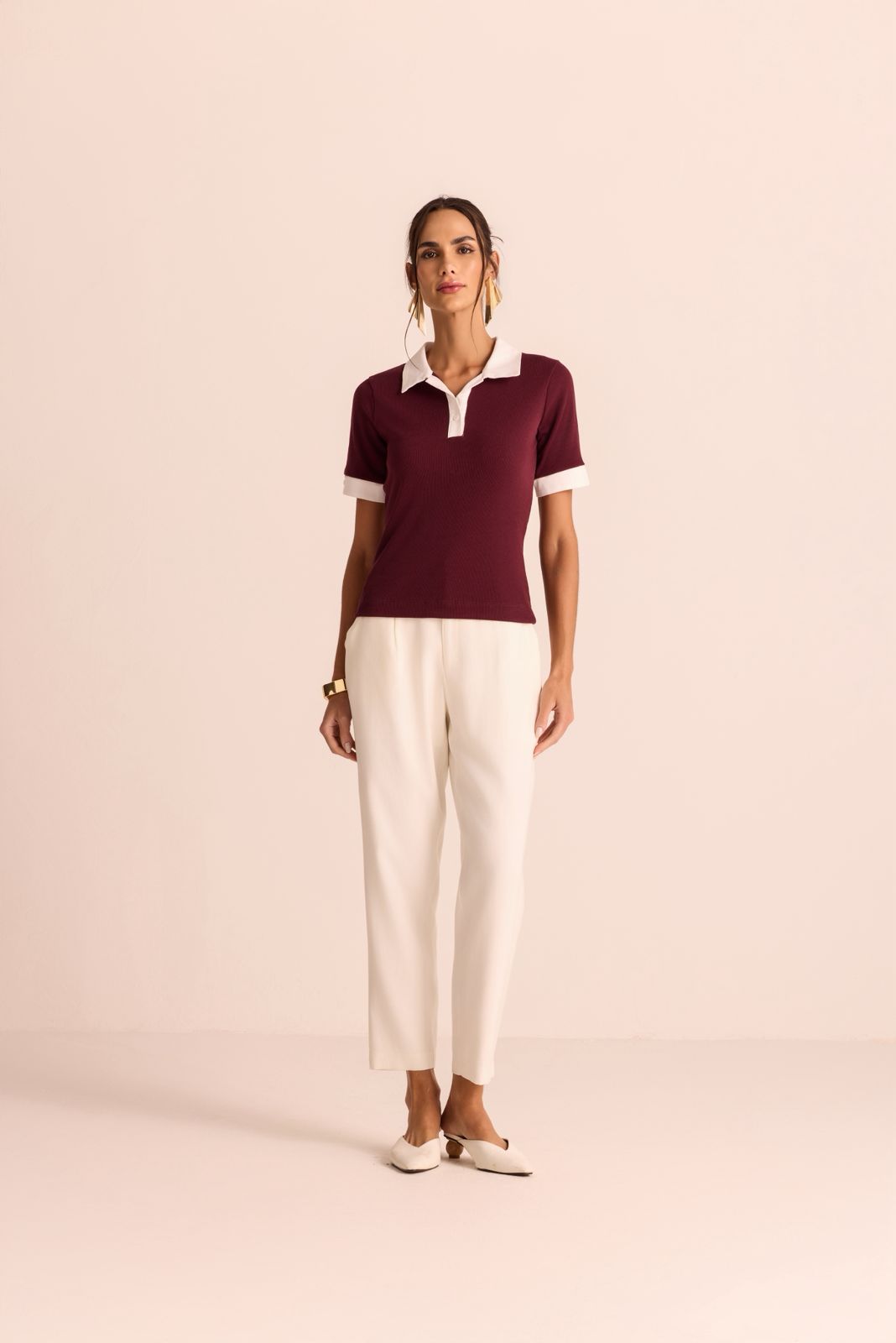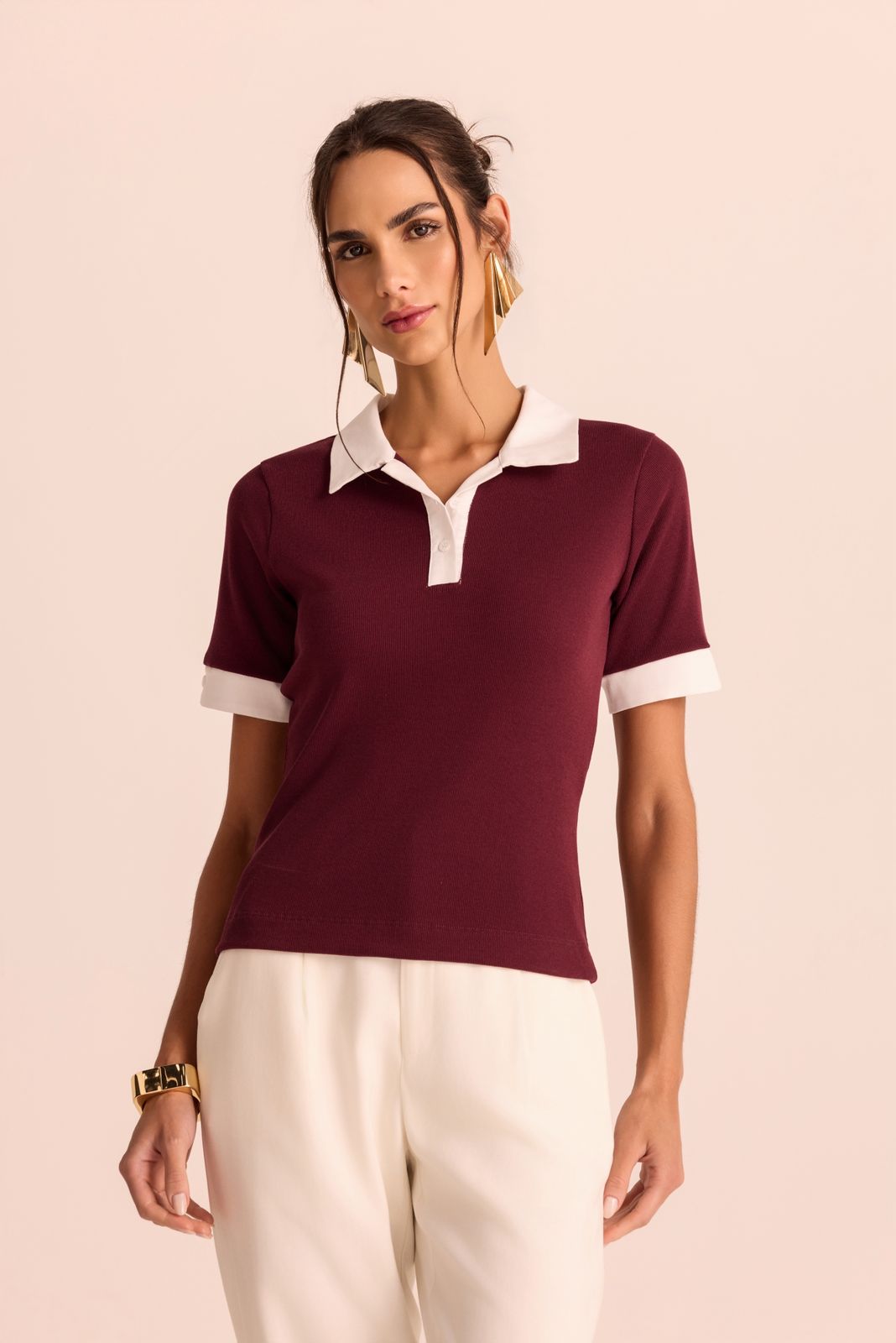 Blusa polo em malha canelada com gola e punho em tricoline com botões na vista e manga.