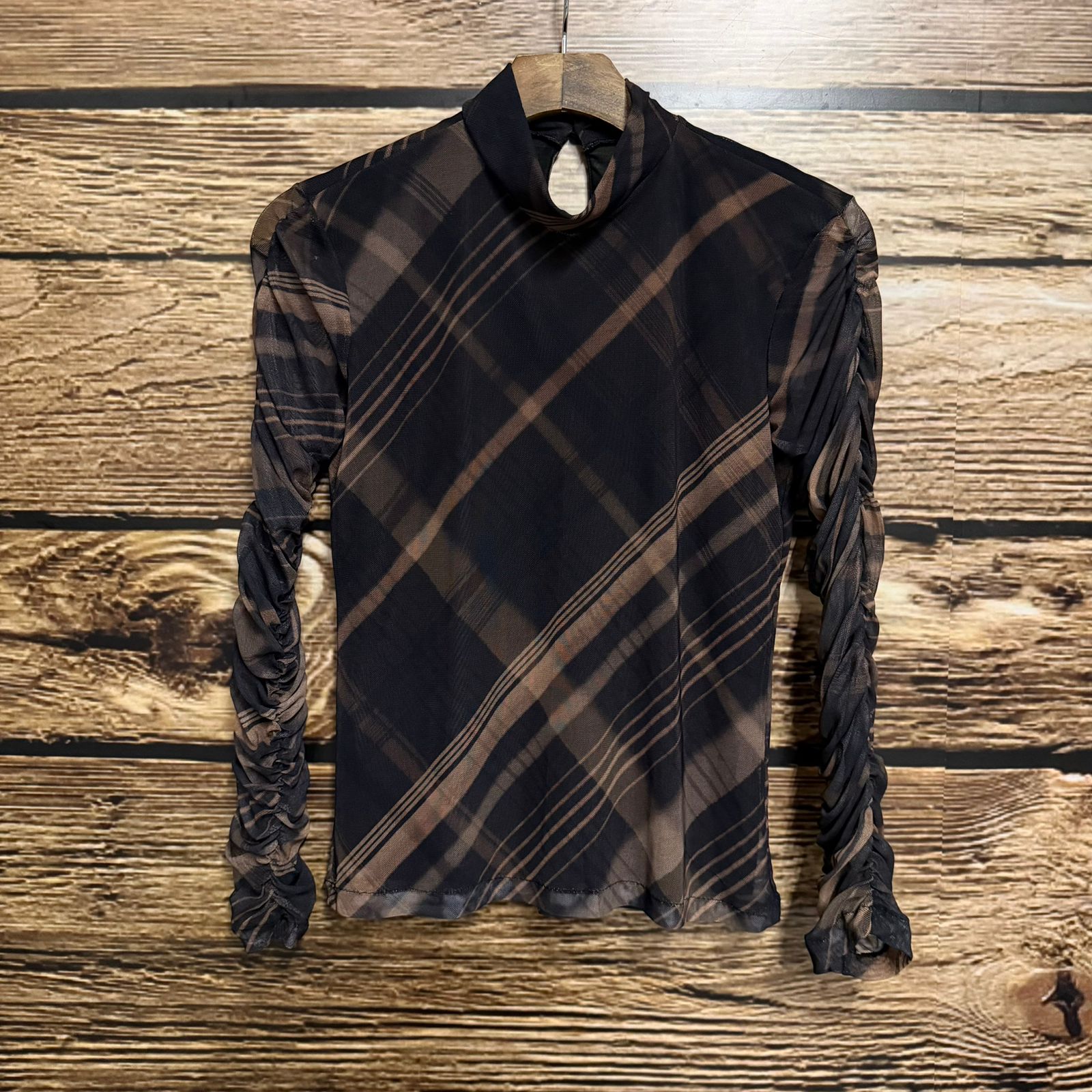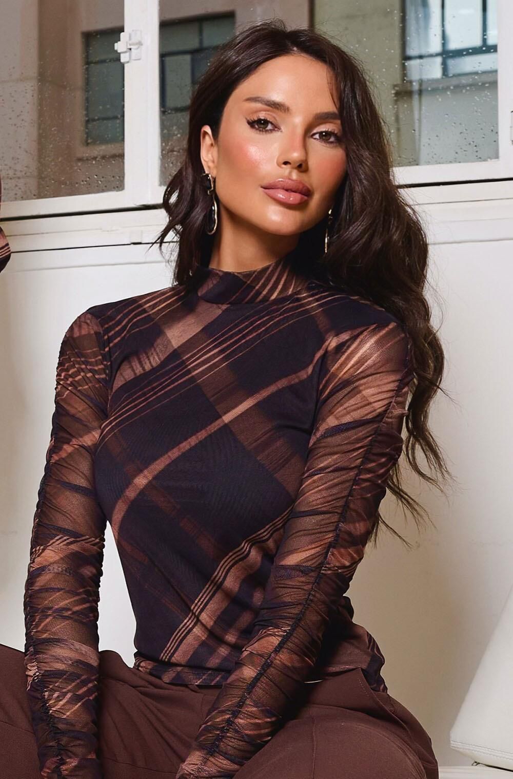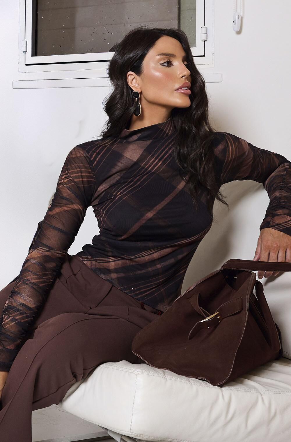 Blusa em tecido tule 96% poliester 4% elastano.