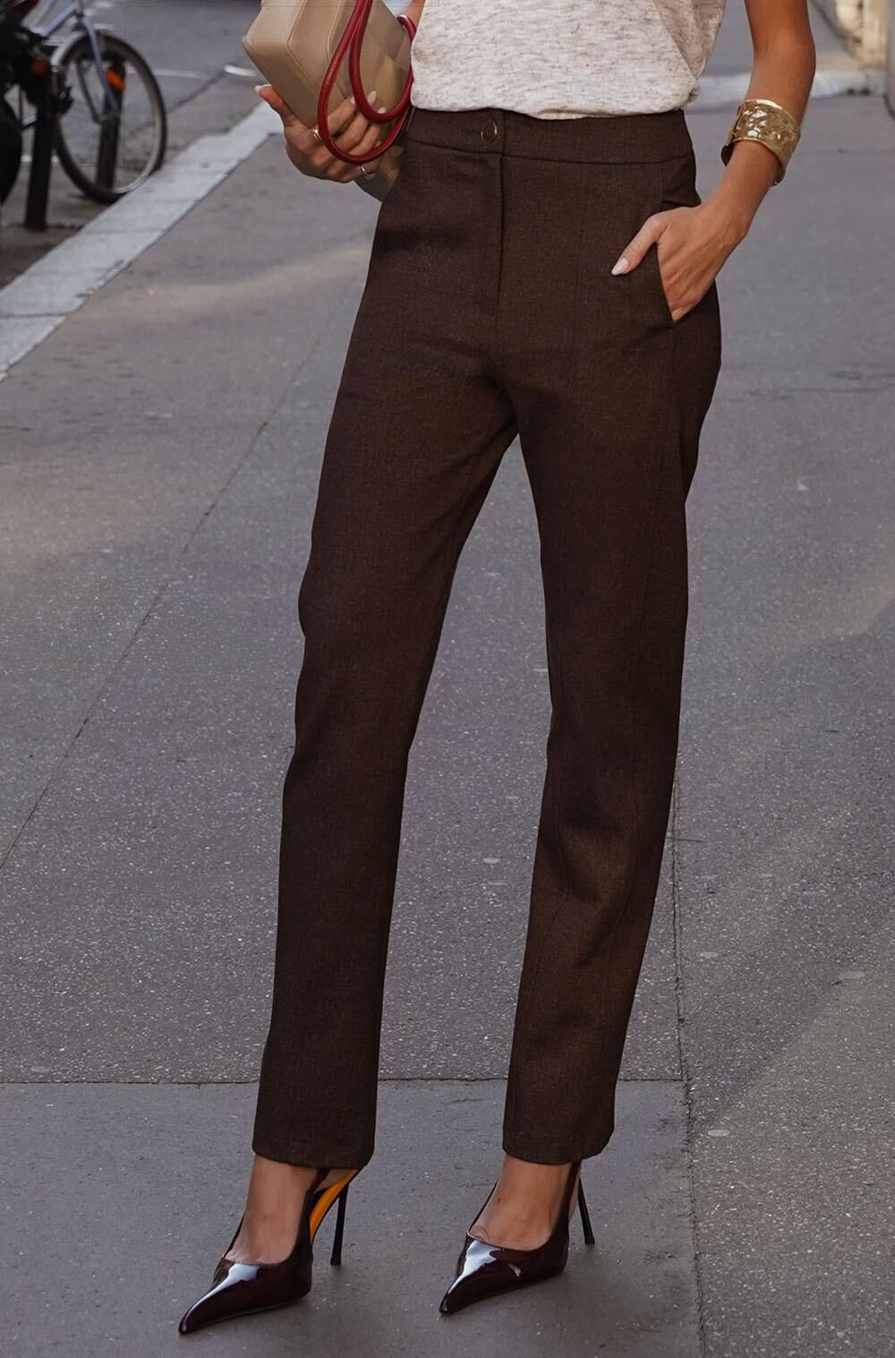 Calça em tecido 40% viscose 30% poliamida 25% poliester 5% elastano.