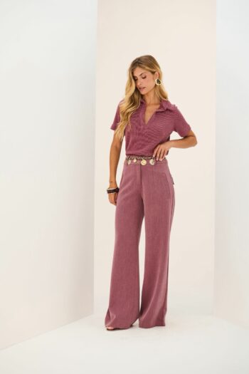 Calça cenoura em alfaiataria estruturada. Possui passantes, fechamento em colchete interno, zíper de nylon, bolso faca e pregas. Acompanha cinto do mesmo tecido com fivela forrada.