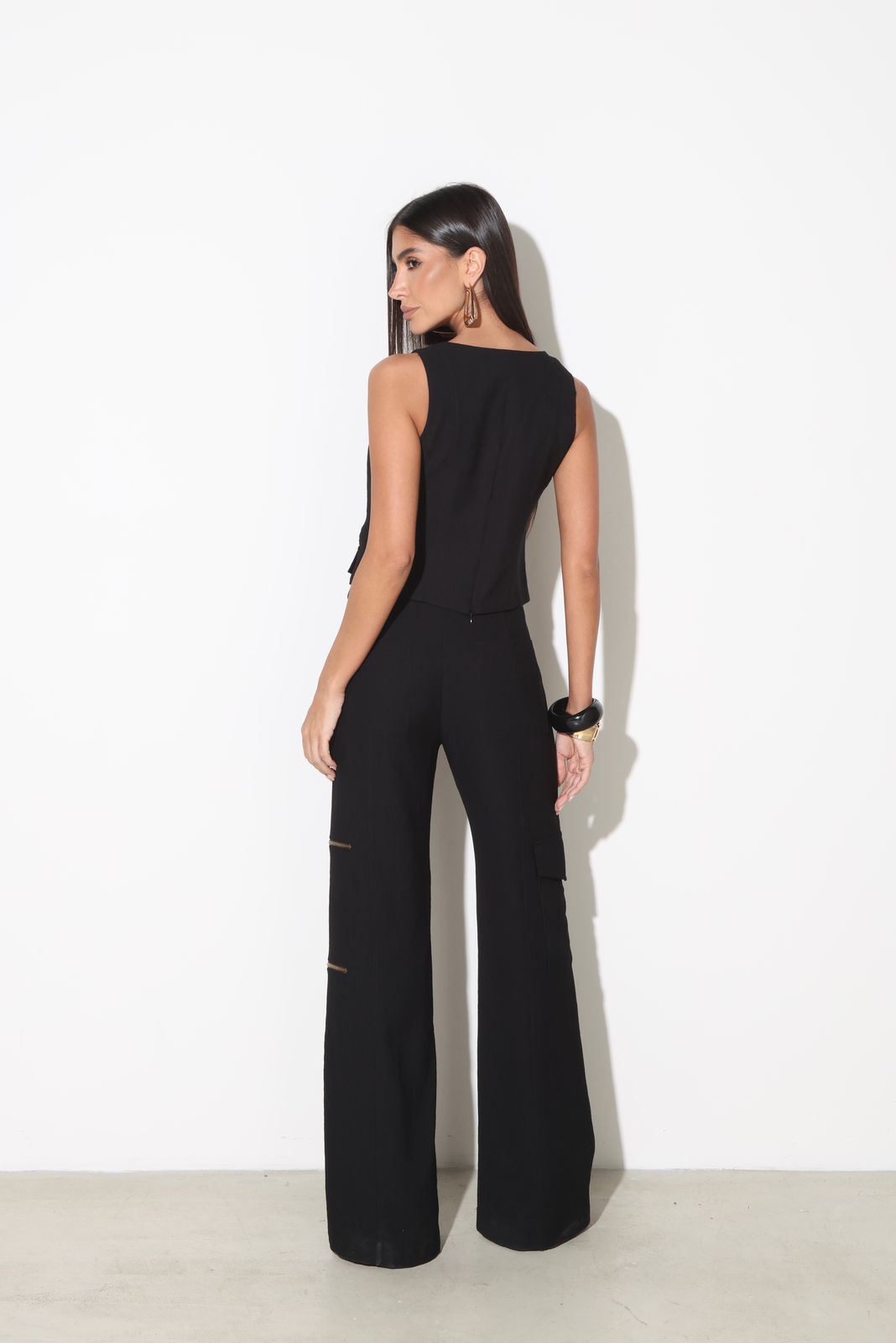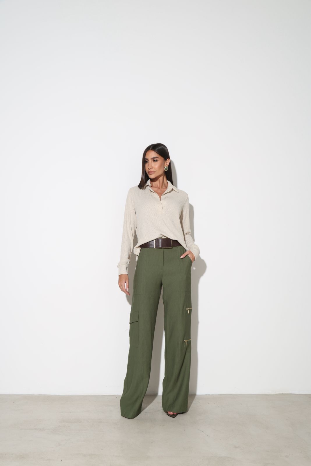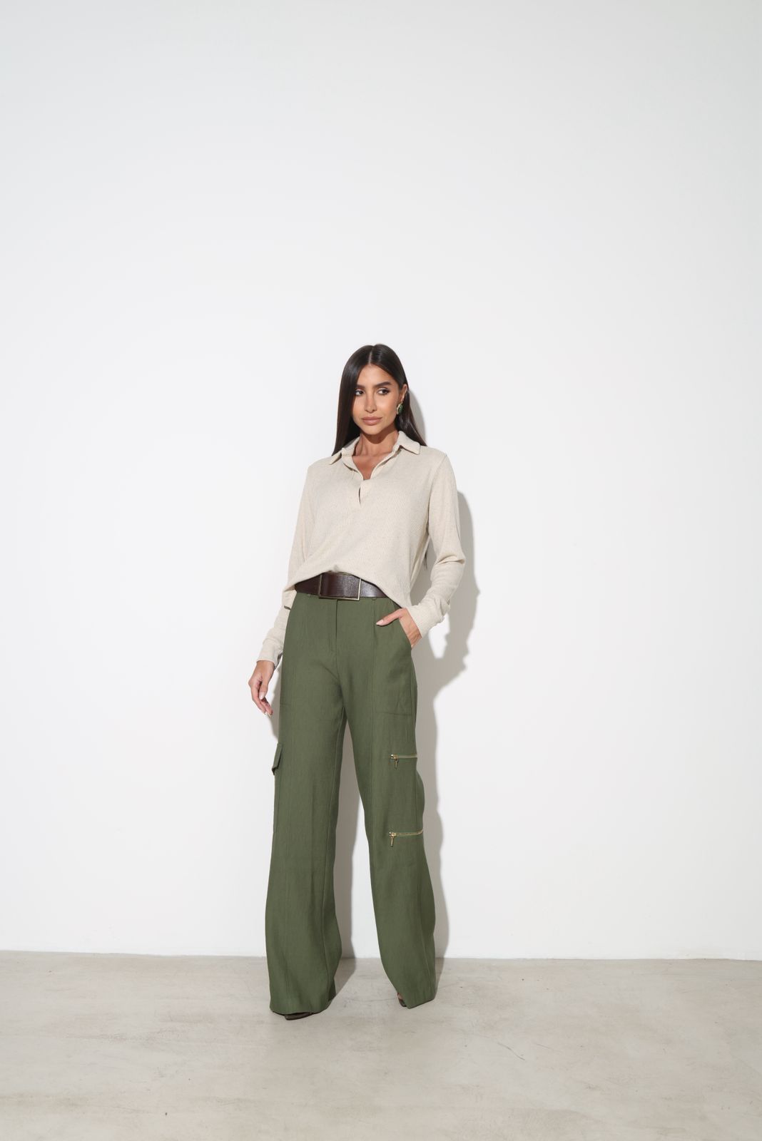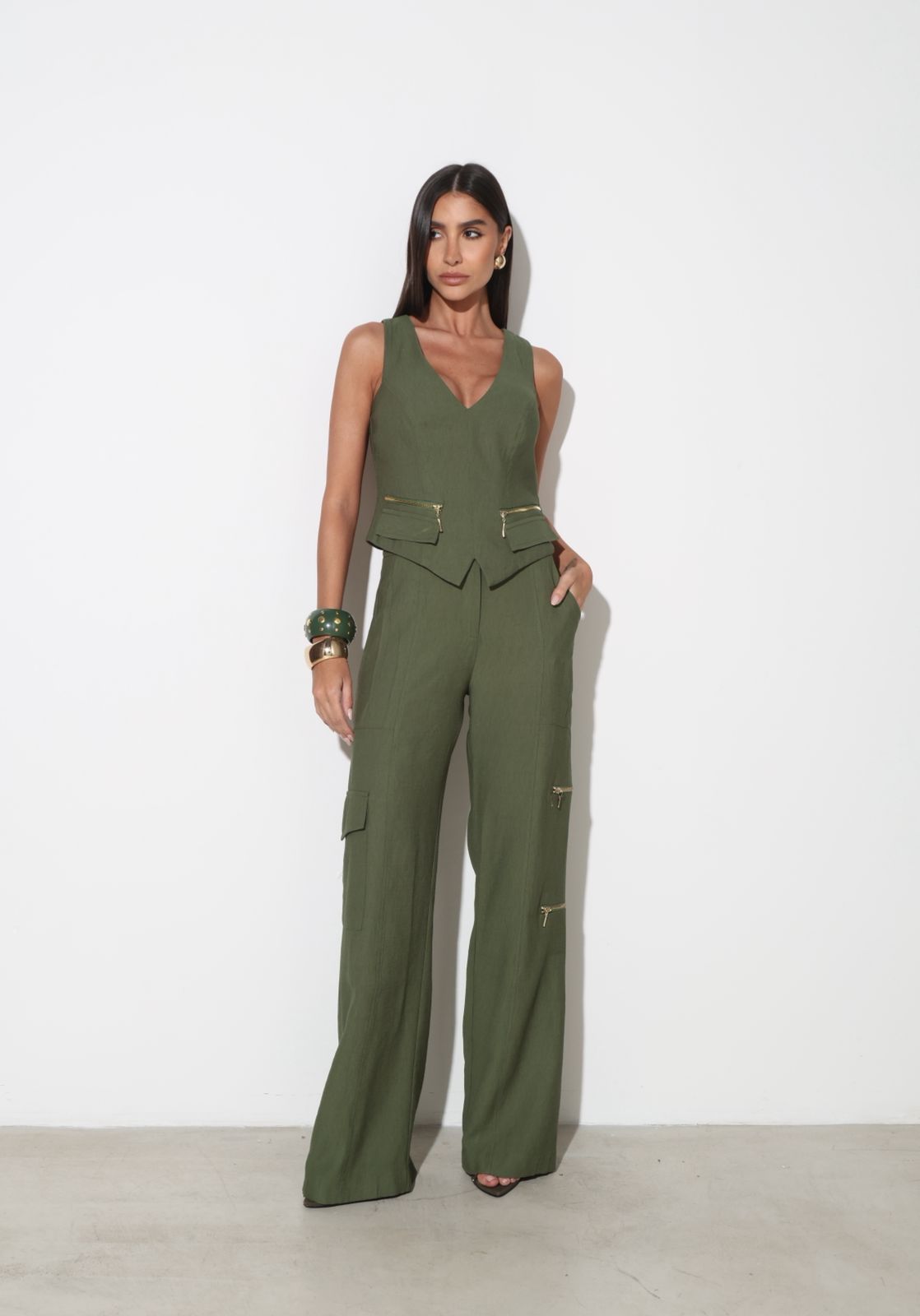Bolsos utilitários na perna com detalhe de zíper