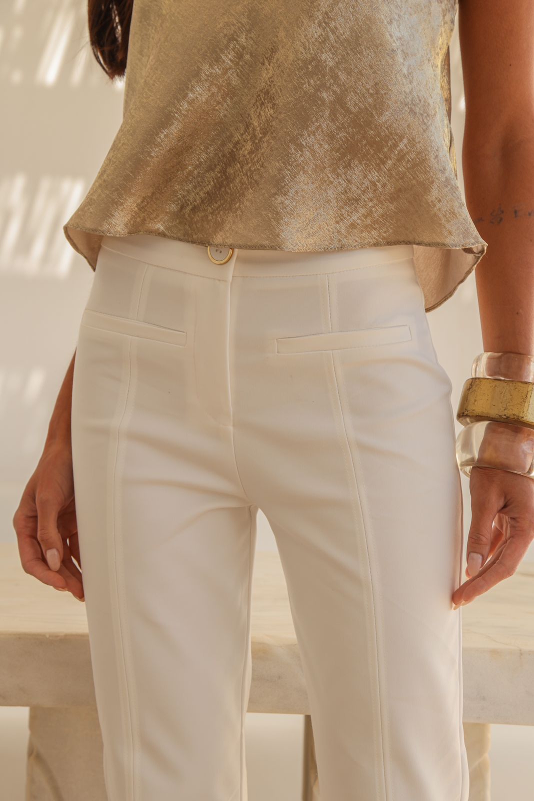 A Calça Nicole traduz modernidade e sofisticação em uma alfaiataria de personalidade. Com modelagem reta e cintura levemente mais alta, valoriza a silhueta com conforto e caimento impecável. O diferencial está nos recortes diagonais na barra, que adicionam um toque de design contemporâneo à peça clássica. Confeccionada em tecido de alfaiataria com elastano, tem estrutura firme com leve elasticidade que garante conforto ao vestir e liberdade nos movimentos.