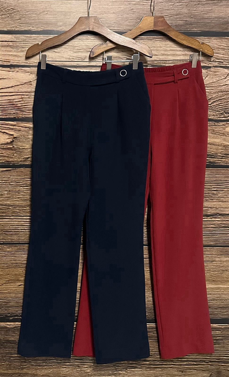 Calça reta em alfaiataria mista de viscose com elastano. Possui cós transpassado com fechamento em botão forrado com aro de metal, botão interno, zíper de nylon, passante, bolso faca, pregas e elástico nas costas.