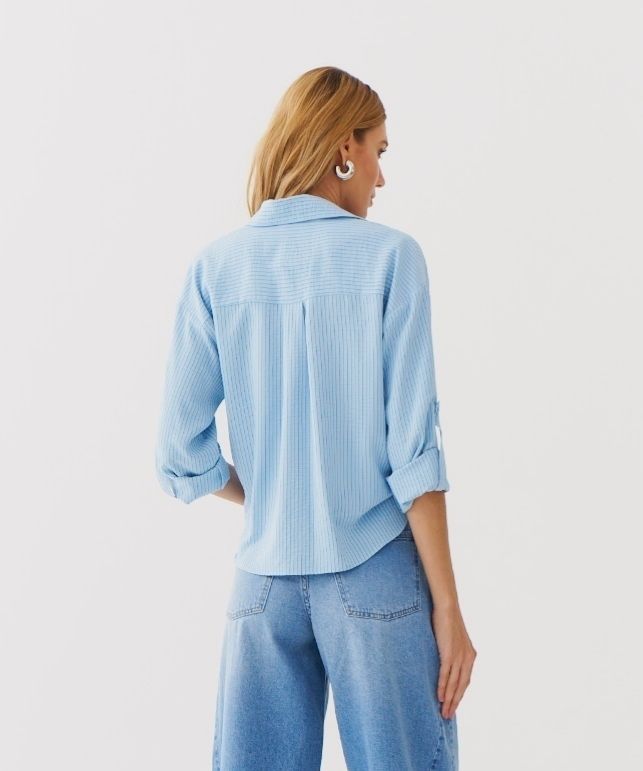 Camisa listra, torção frente, alongada e arredondada atrás.