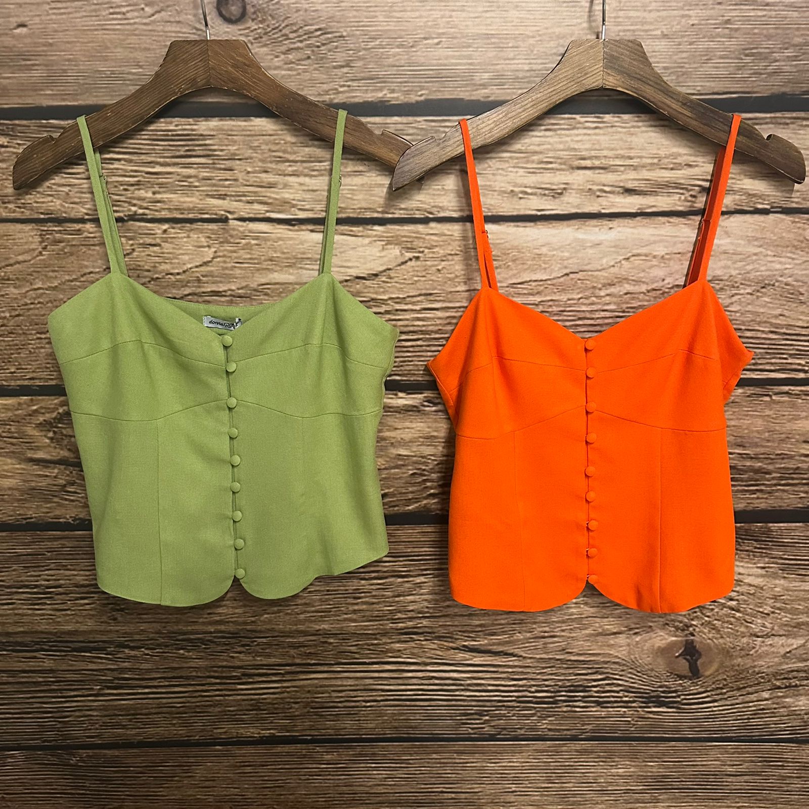 Colete em linho. Possui alças reguláveis, fechamento na frente em botão forrado, vista interna e forro.