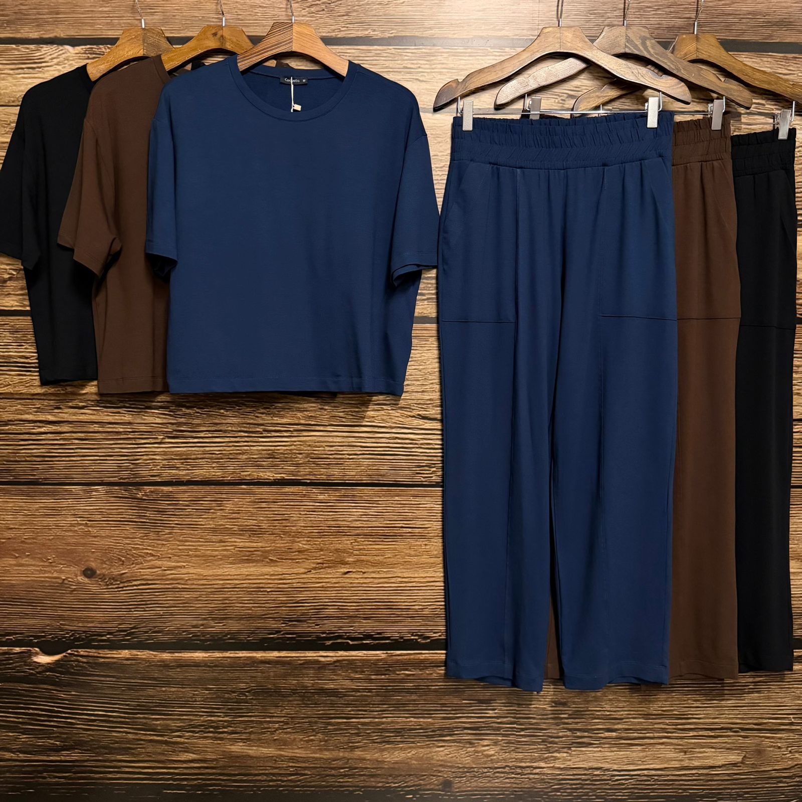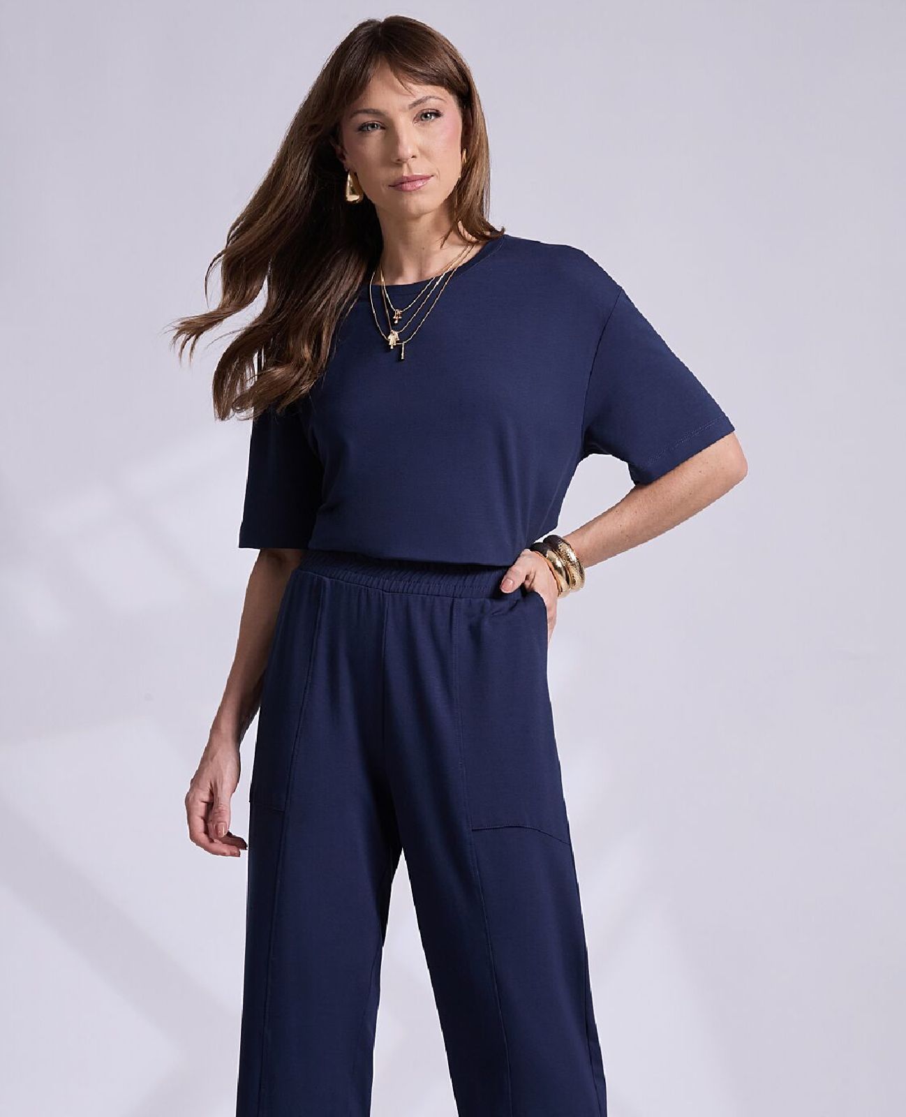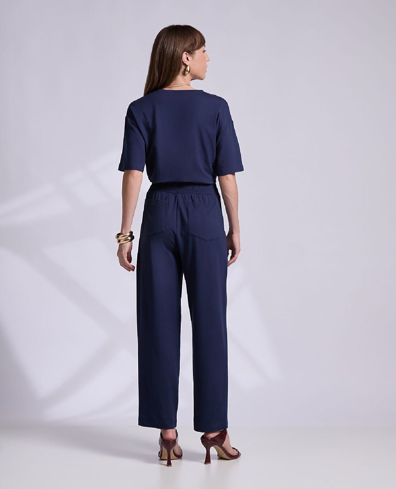 Conjunto calça com cós de elástico, bolsos na frente e atrás com blusa de manga curta.