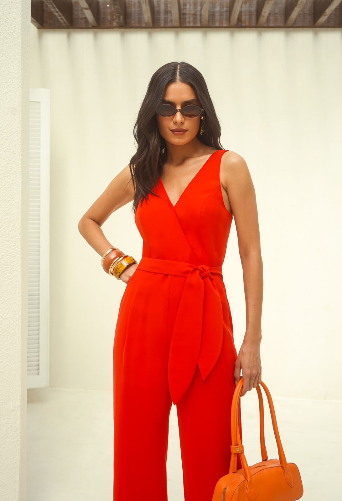 Macacão alfaiataria mista de viscose texturizada. Possui decote em V com botão interno, alças reguláveis, bolso faca, prega, fechamento em zíper de metal nas costas e forro. Acompanha faixa do mesmo tecido para amarração.