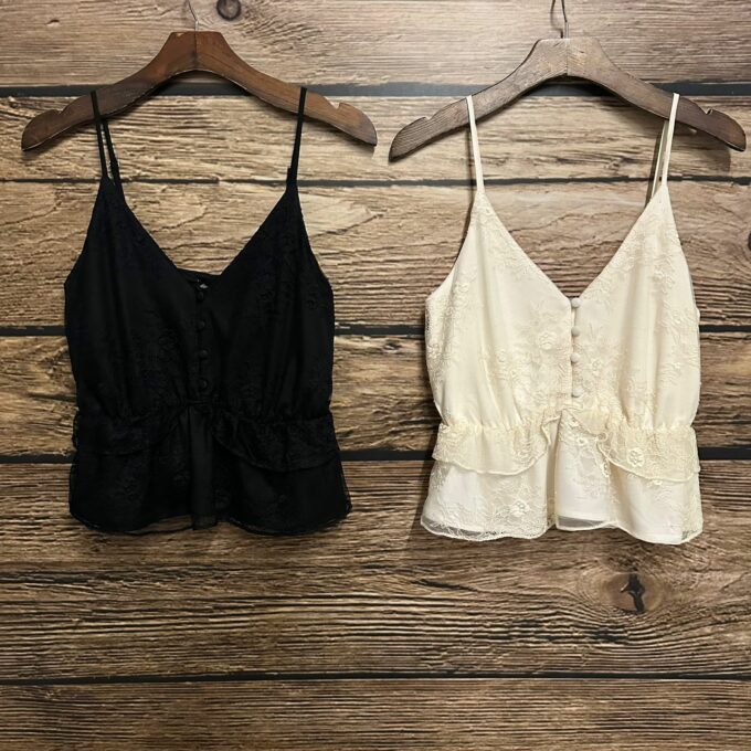 Regata renda. Possui alça com regulador, aselha com botão forrado na frente, babado na barra, elástico nas costas e forro.