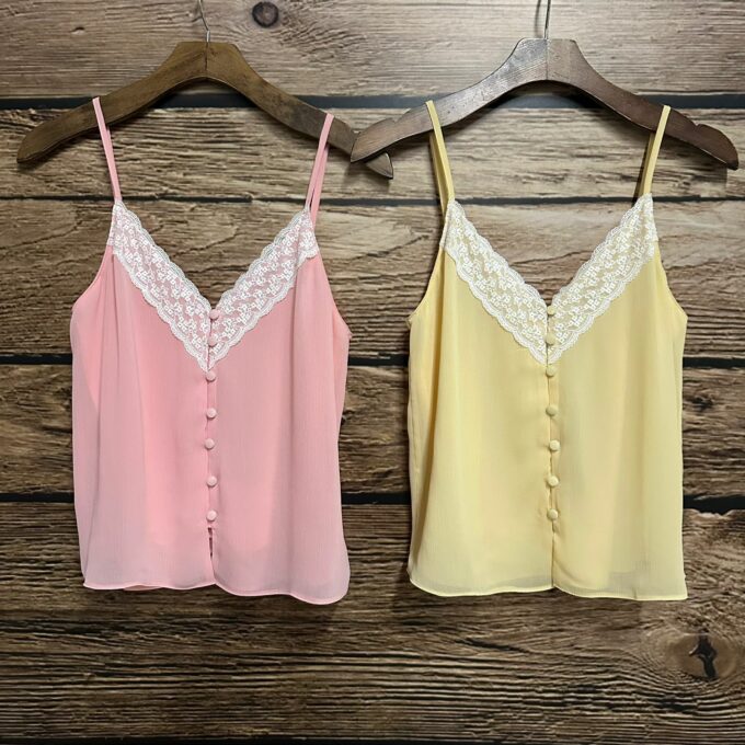 Alça em yoryu. Possui aplicação de renda no decote, botão forrado e alças reguláveis.