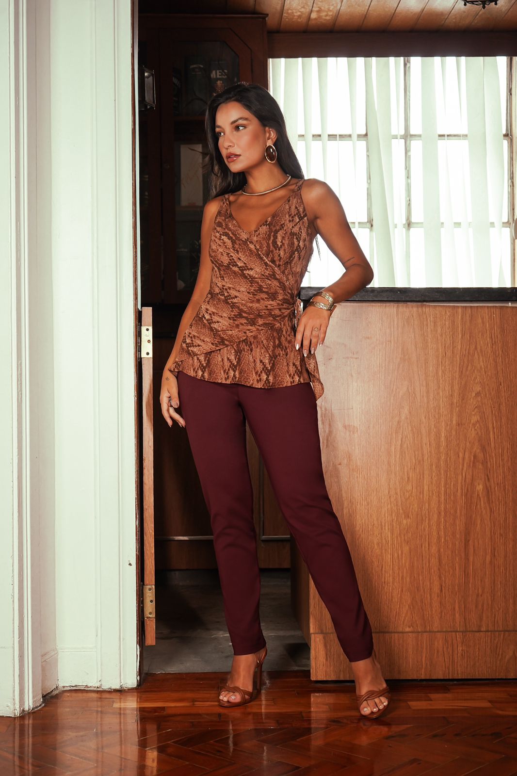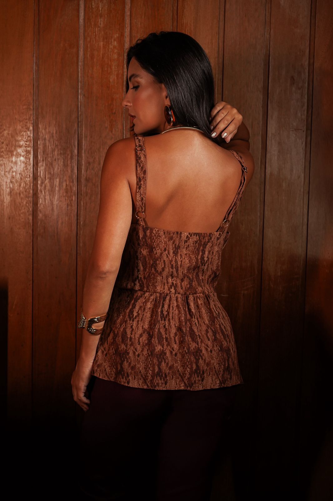 Alça em yoryu estampado. Possui transpasse na frente com amarração lateral, zíper de nylon lateral, alças reguláveis e forro.
