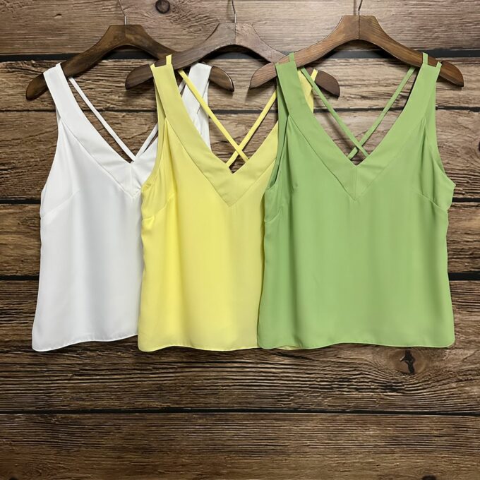 Alça em crepe liso. Possui decote V com roletê fixo cruzado nas costas.