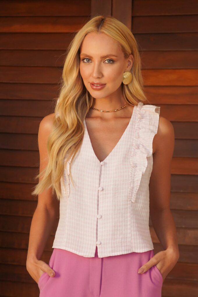 Regata vichy em alfaiataria leve com textura de linho. Possui decote em V com fechamento em botão forrado na frente e babado.