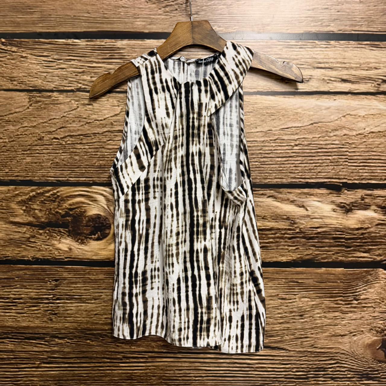 Regata em alfaiataria leve texturizada com drapeado na gola e fechamento em botão nas costas.