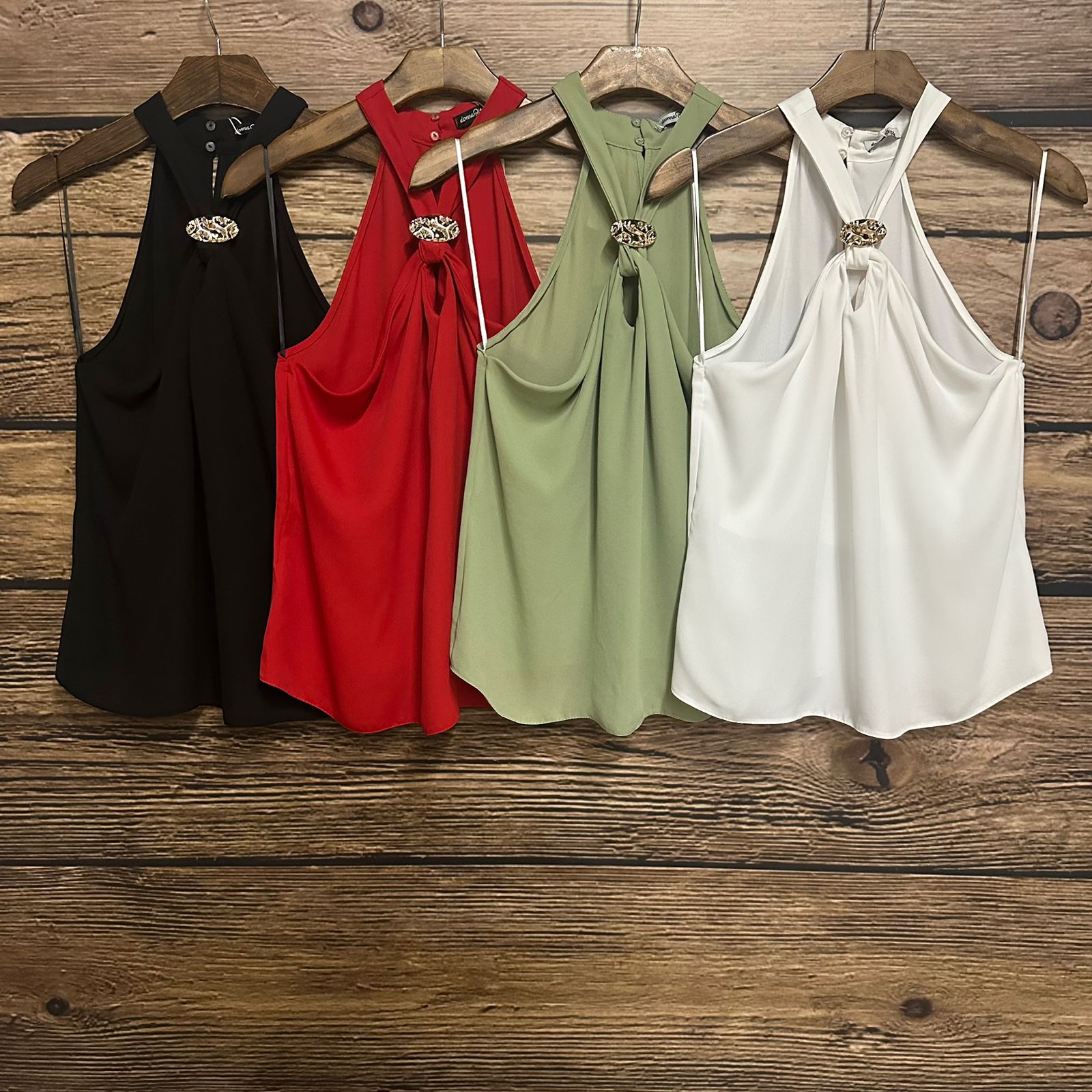 Regata em crepe liso. Possui decote vazado na frente com aviamento de metal orgânico, frente dupla com fechamento em botão nas costas.