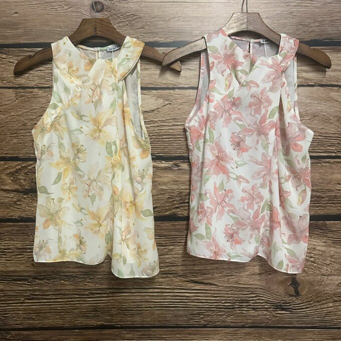 Regata em crepe floral exclusivo. Possui gola assimétrica com drapeado e fechamento em botão nas costas.