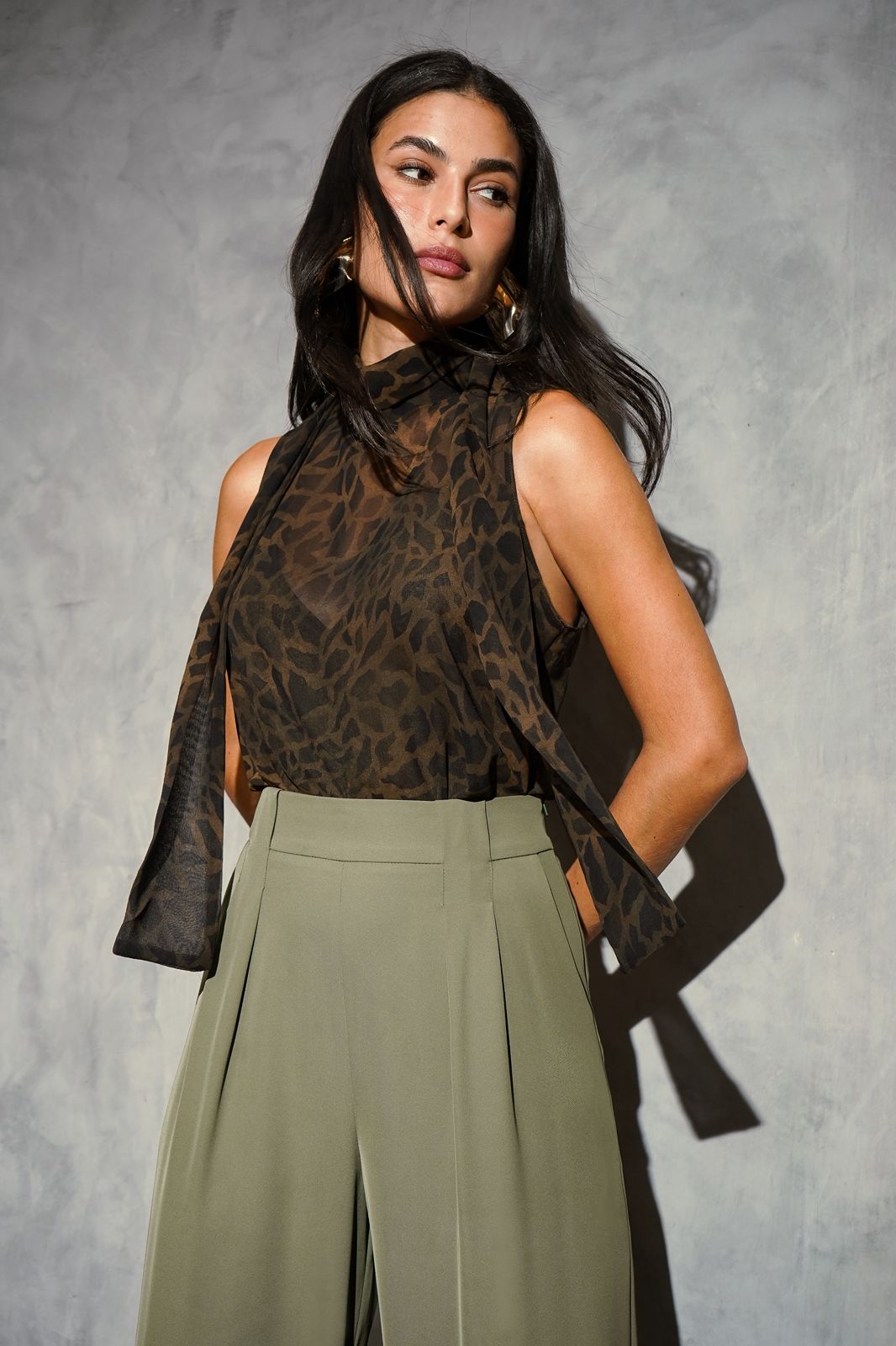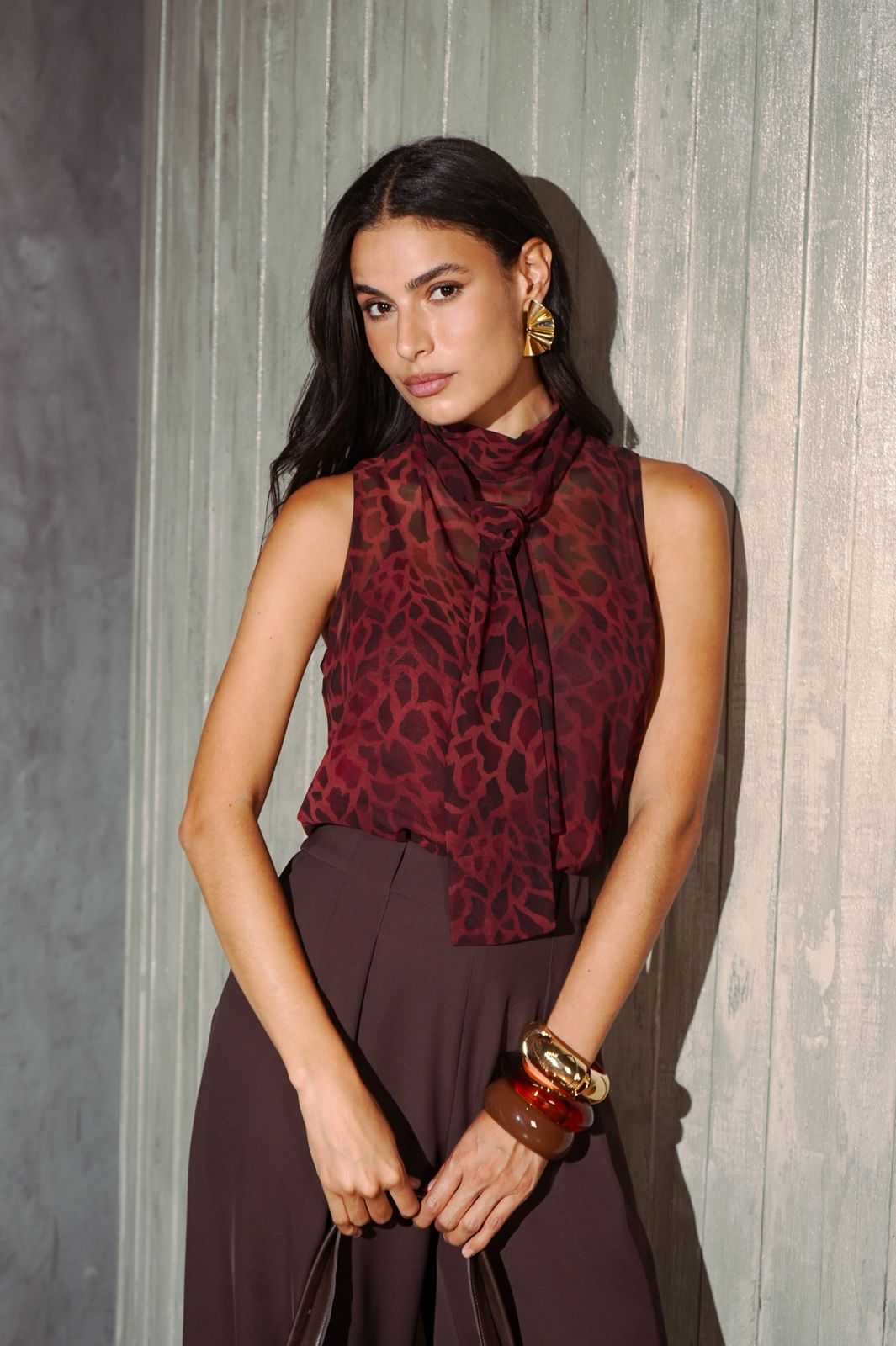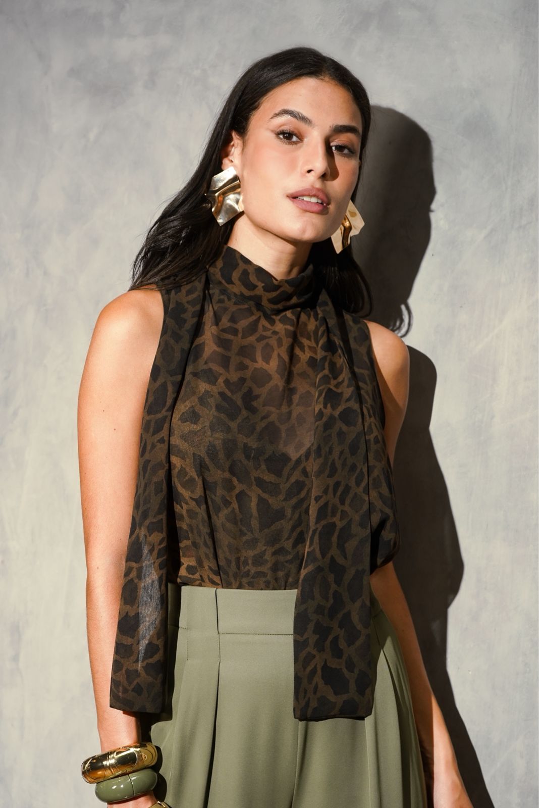 Regata em chiffon estampado. Possui gola com faixa para amarração e fechamento nas costas em botão. Acompanha combinete.