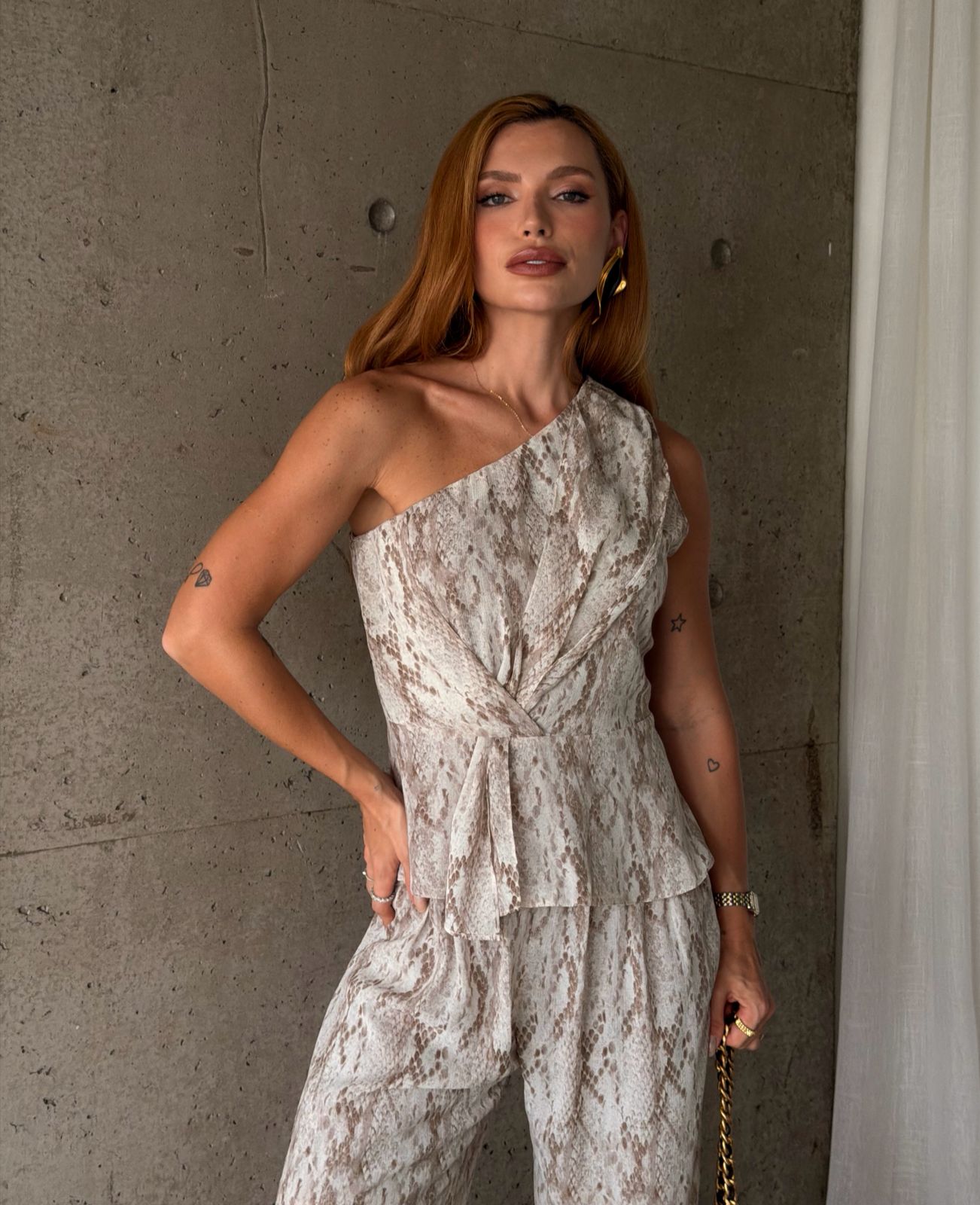 Regata em yoryu estampado. Possui modelagem um ombro com elástico no decote, faixa sobreposta na frente, zíper de nylon lateral e forro.