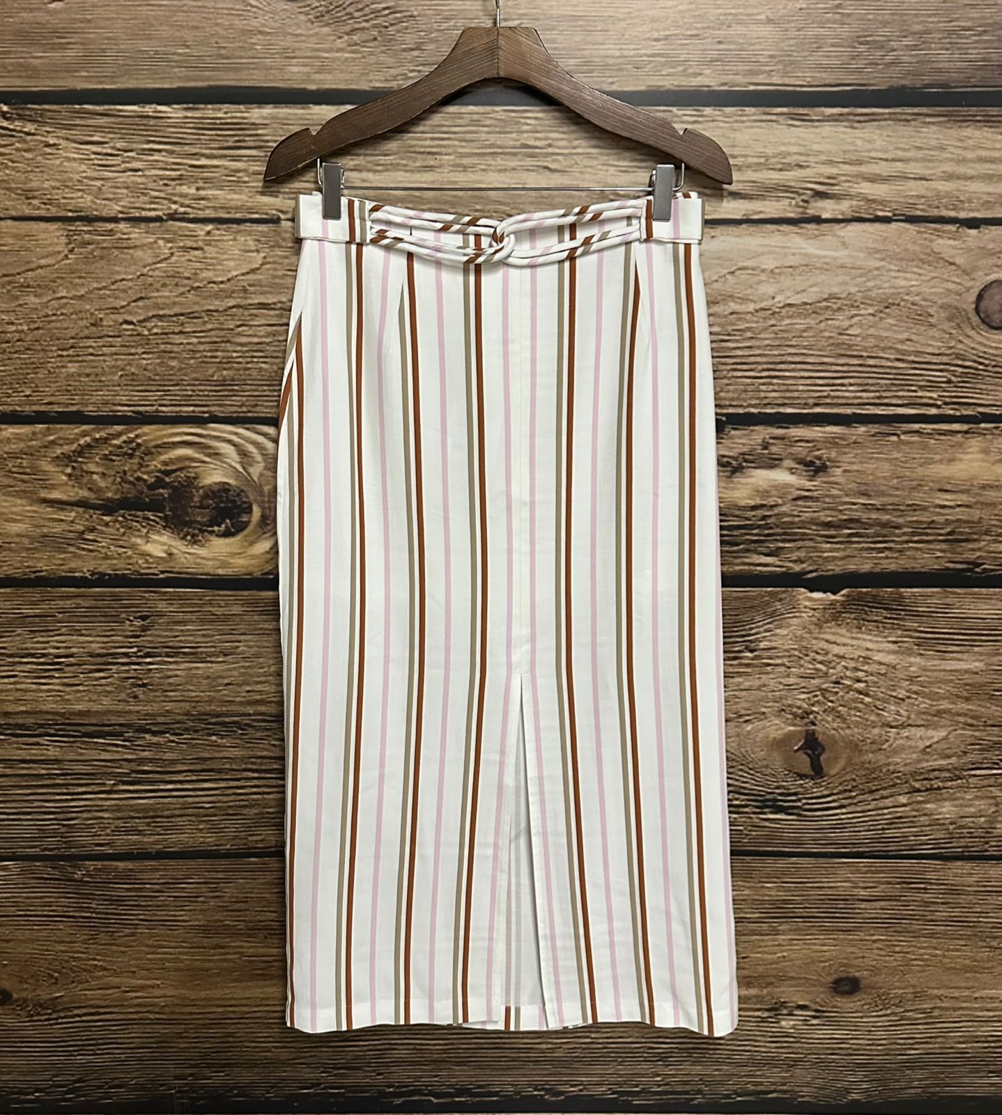 Saia lapís com comprimento midi possuindo fenda na barra.