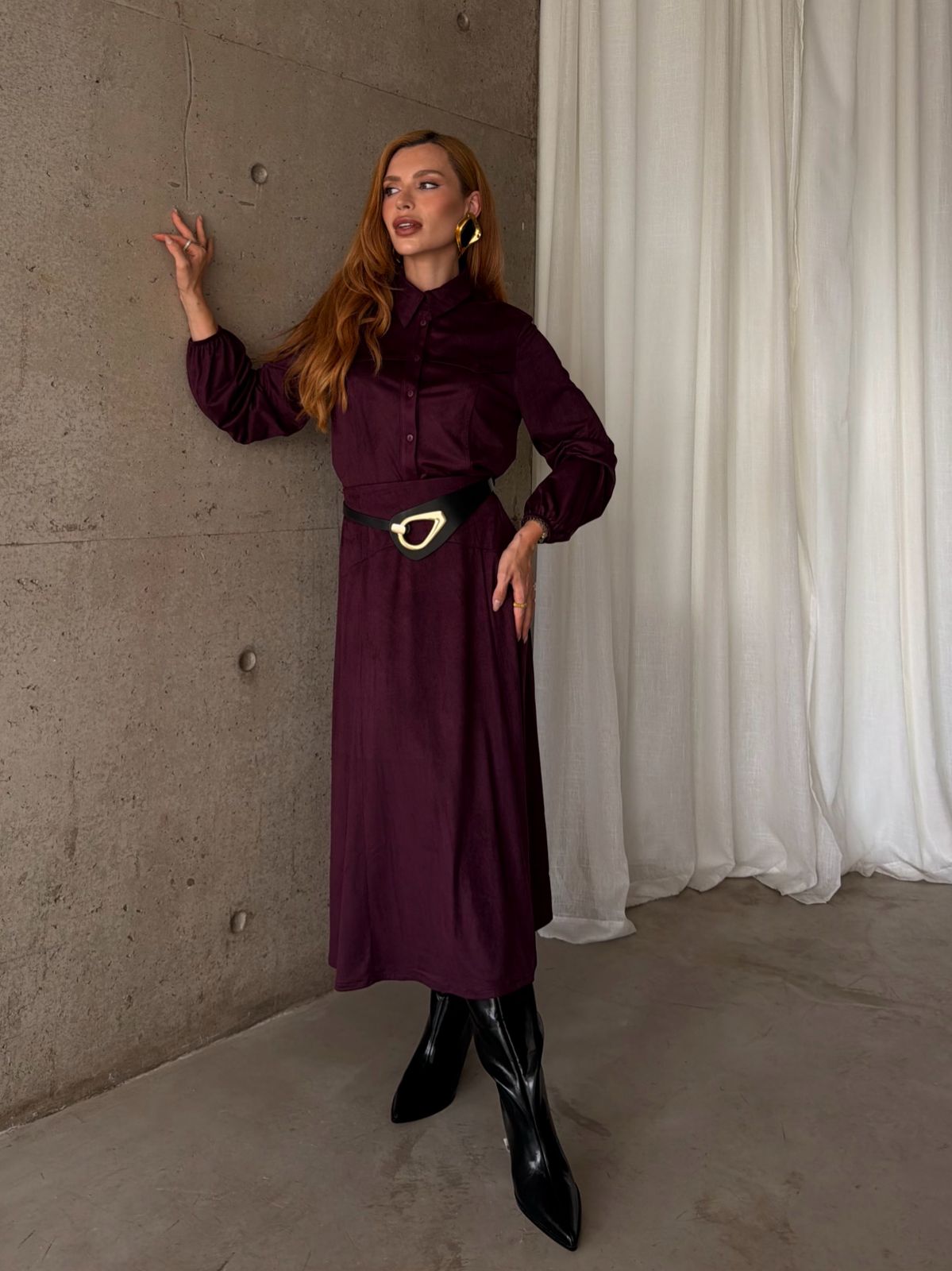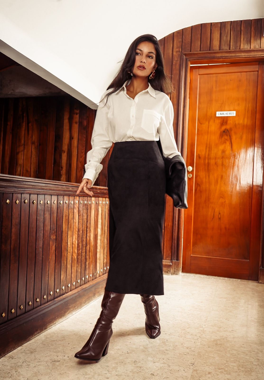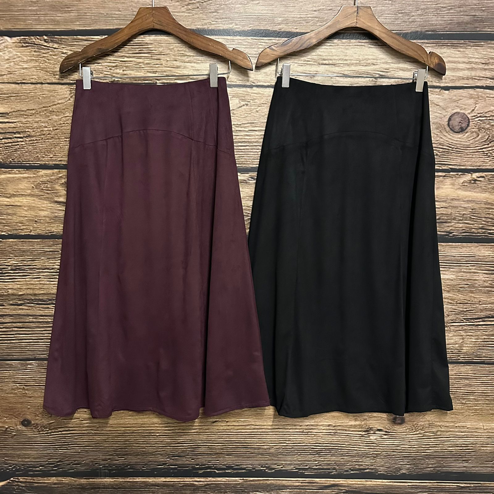Saia midi em suede. Possui elástico na cintura, zíper de metal nas costas e forro.