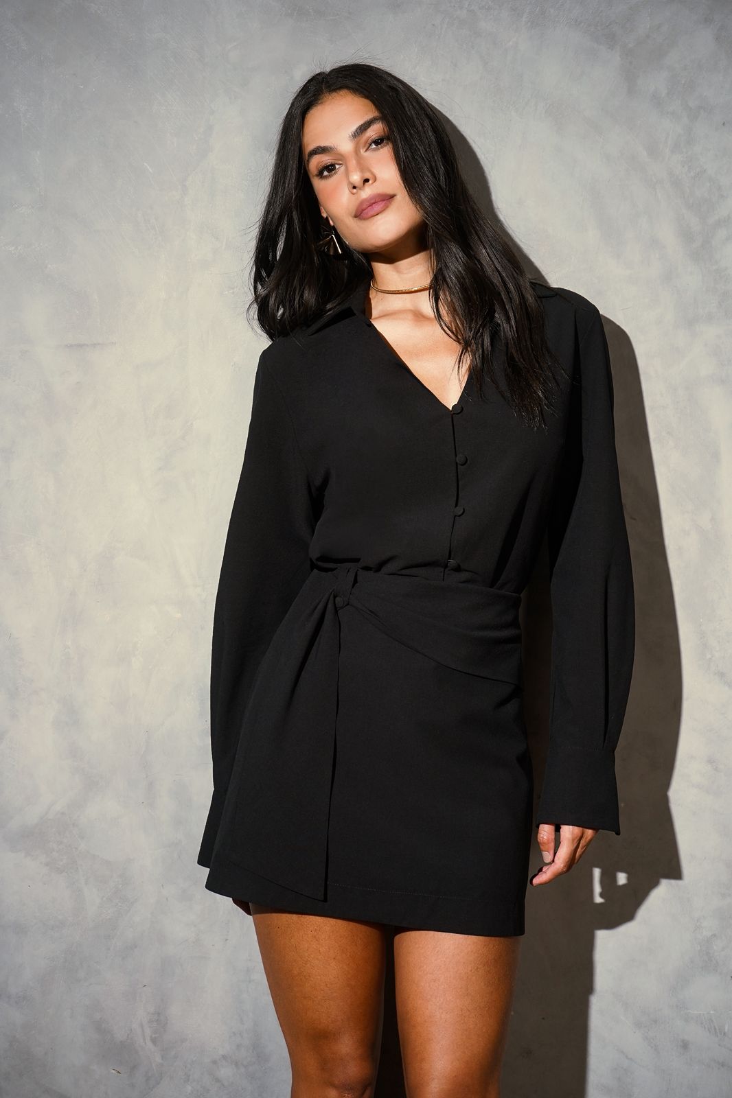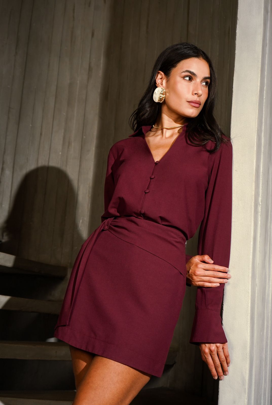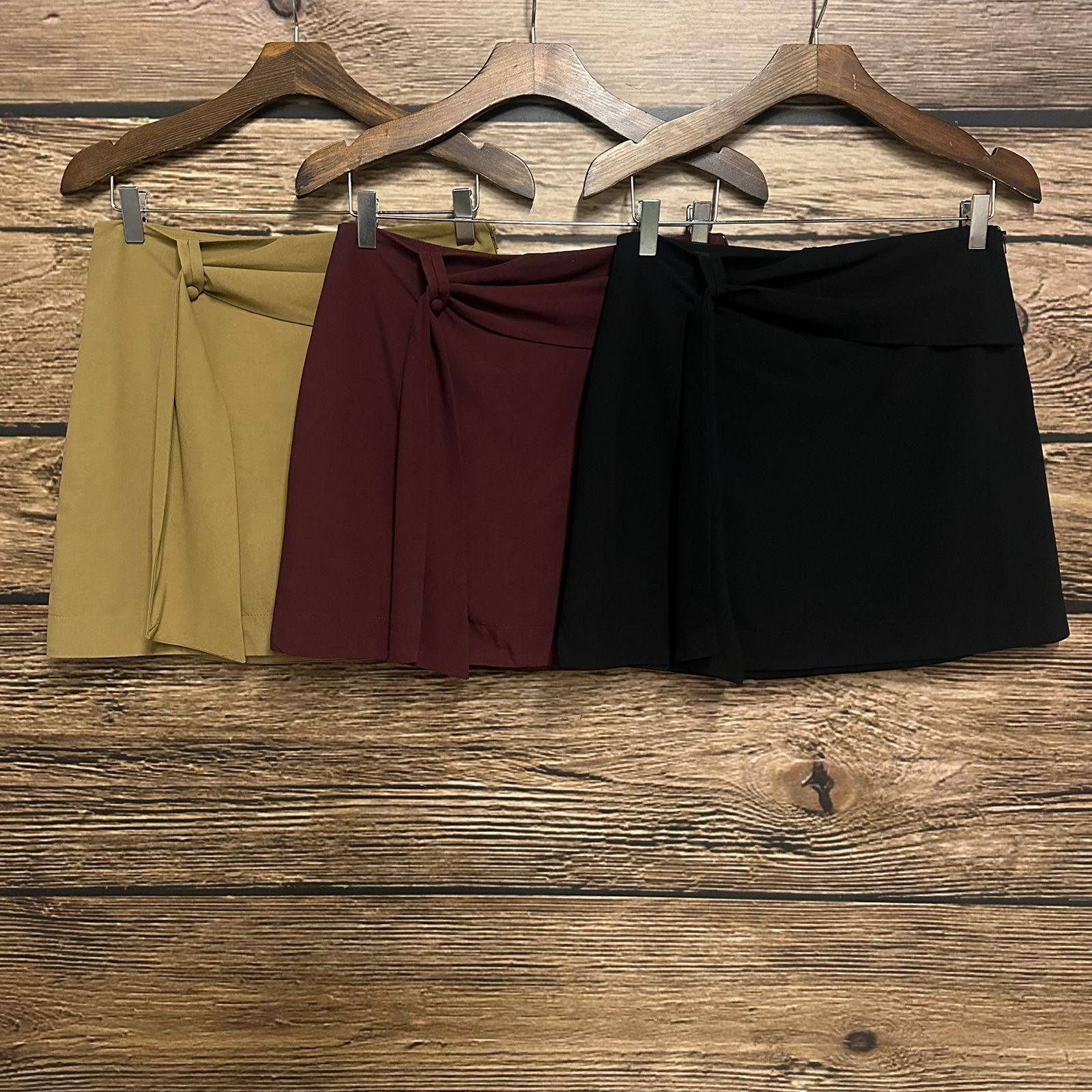 Saia mini em alfaiataria mista com algodão. Possui faixa dupla presa na lateral, passante com botão forrado, zíper de nylon lateral e forro shorts.