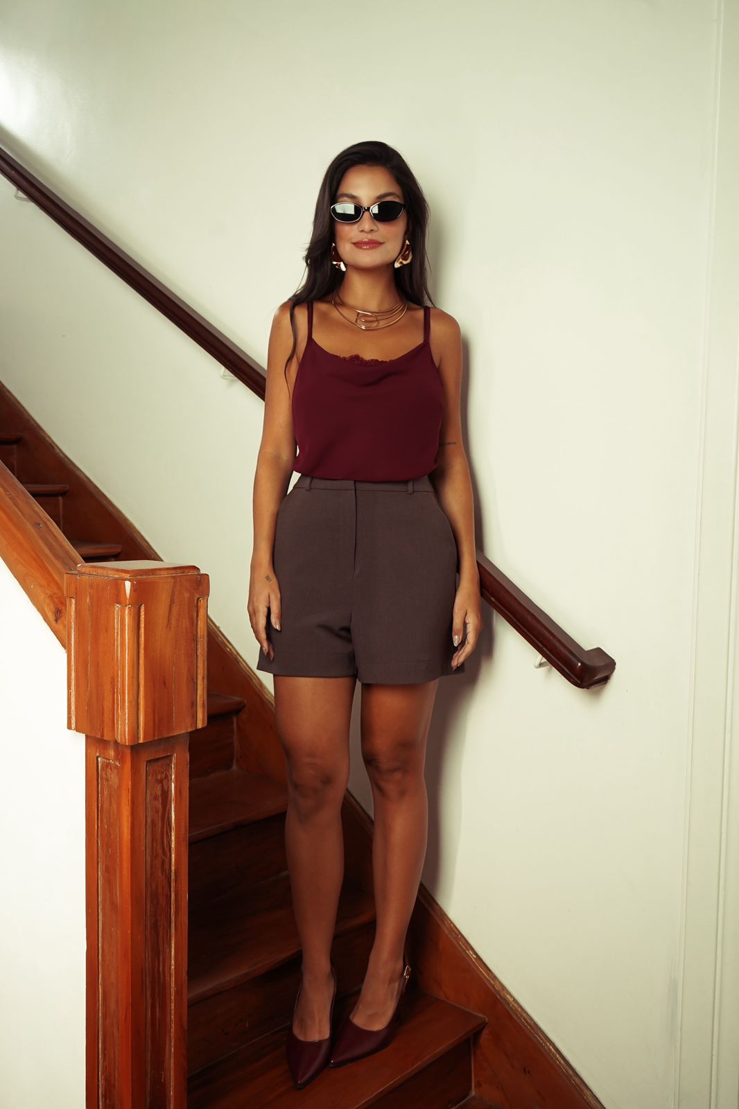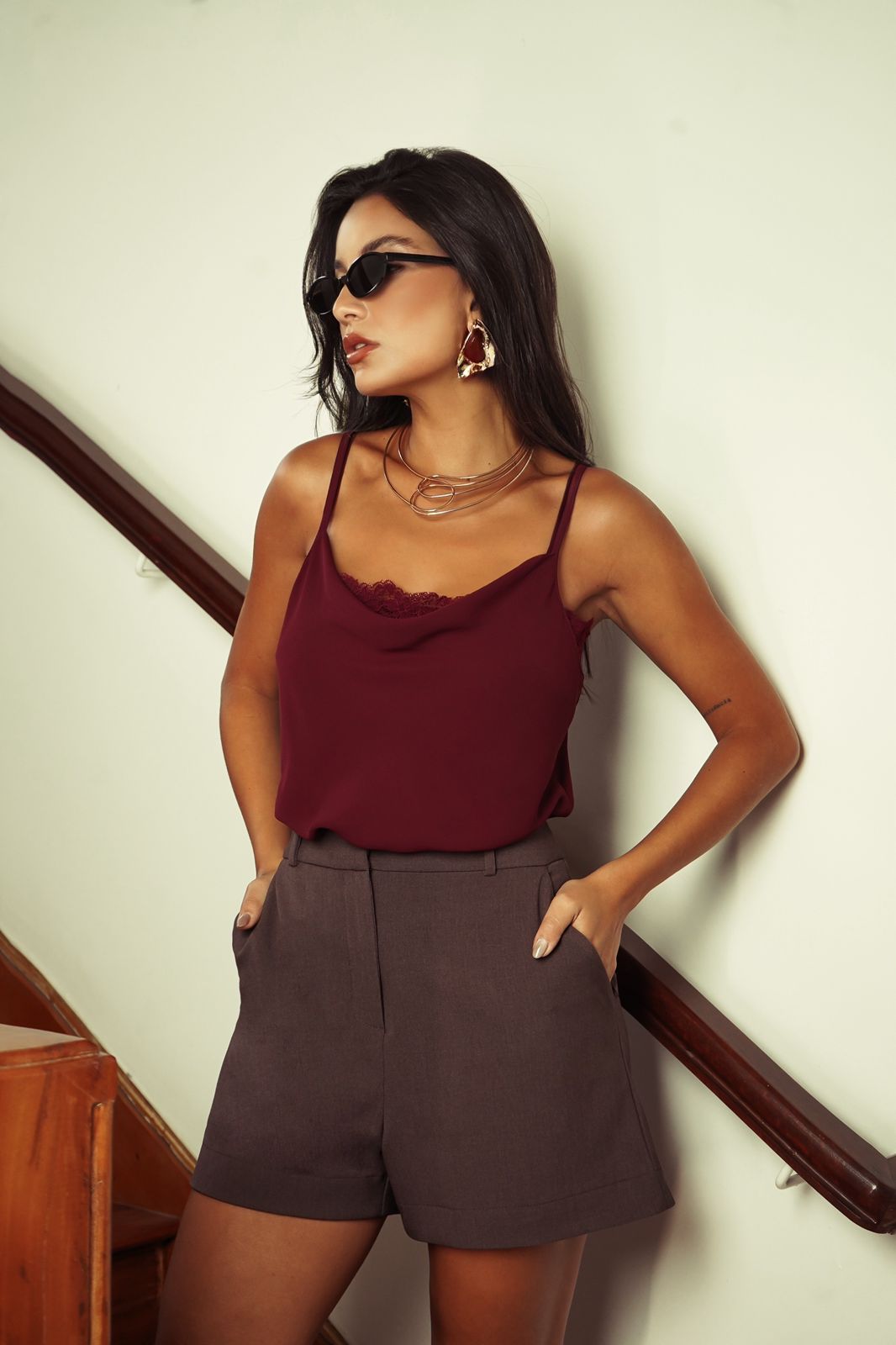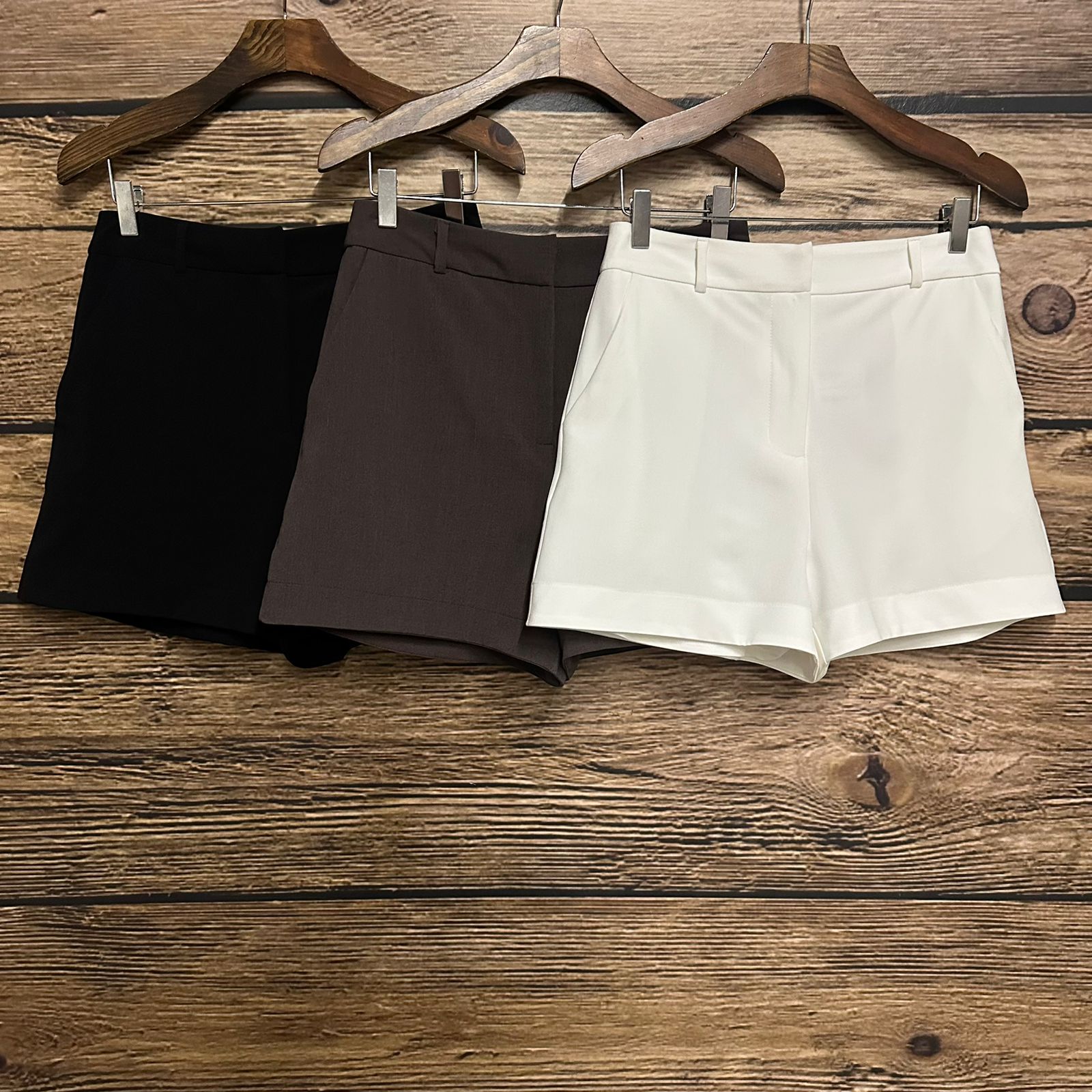 Shorts em alfaiataria mista de viscose com elastano. Possui cós com fechamento em colchete interno, zíper de nylon, passantes, bolso faca e forro.