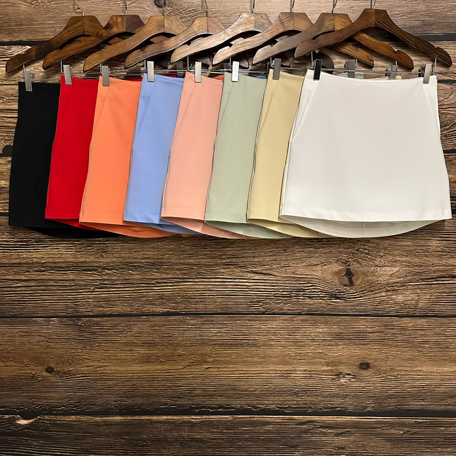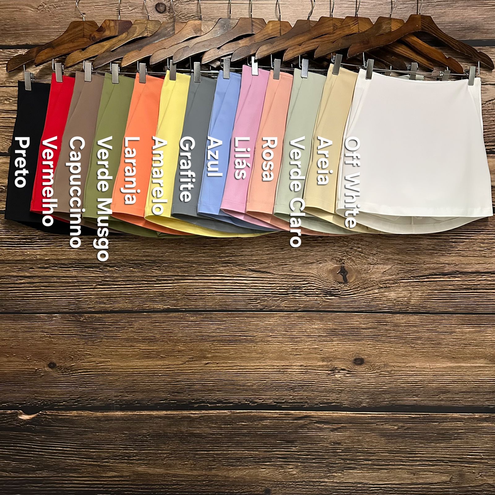 Shorts saia confeccionado em cotton, o shorts fica apenas por dentro para maior conforto, e o modelo é de saia do lado de fora na frente e nas costas. Ele tem bolsinho faca nas laterais.