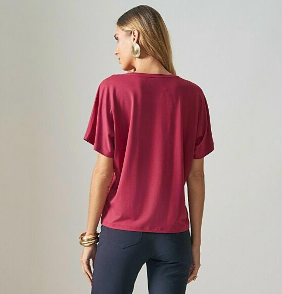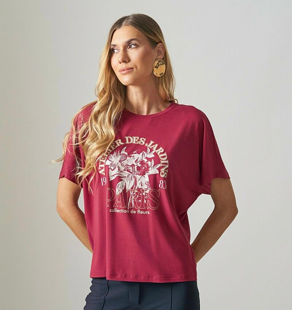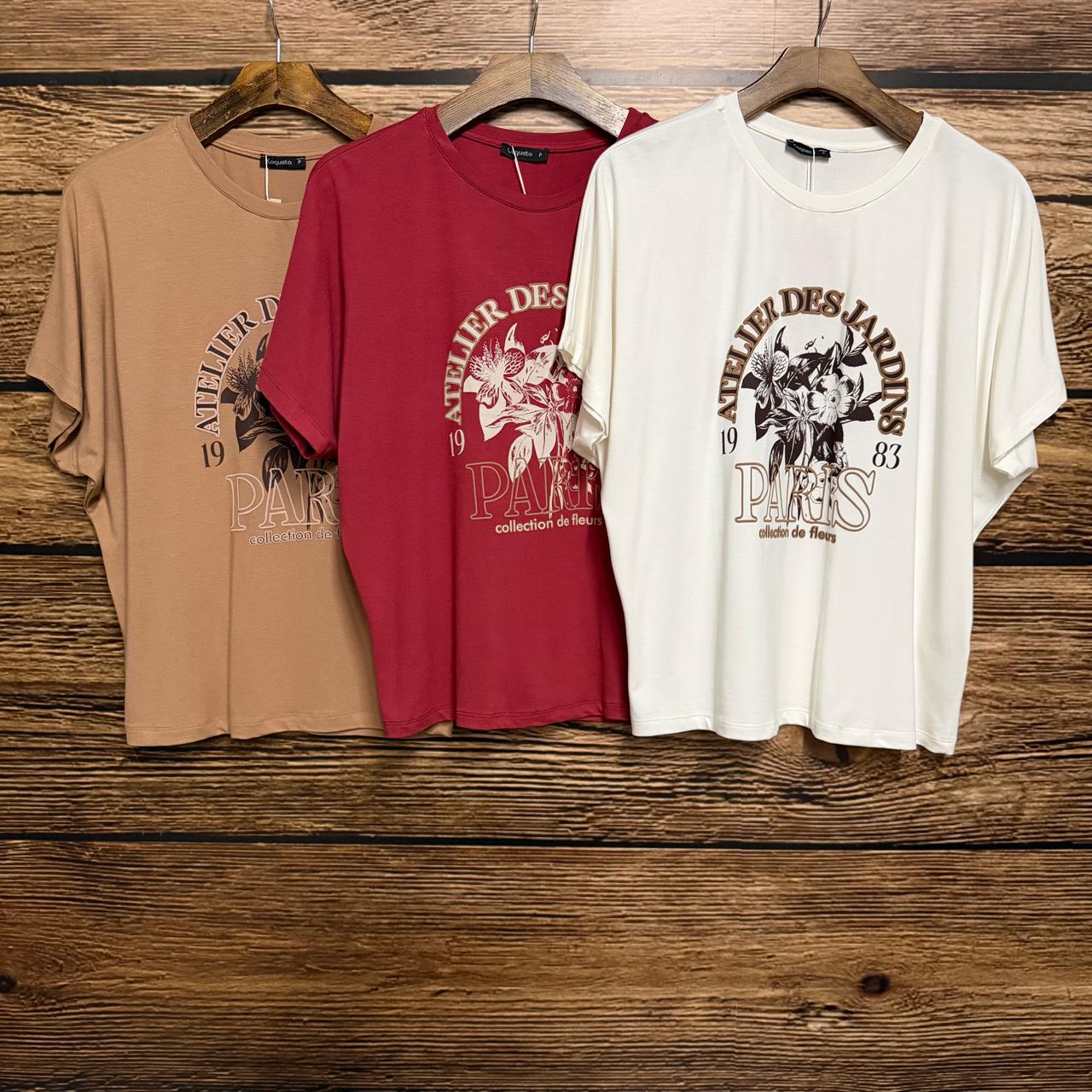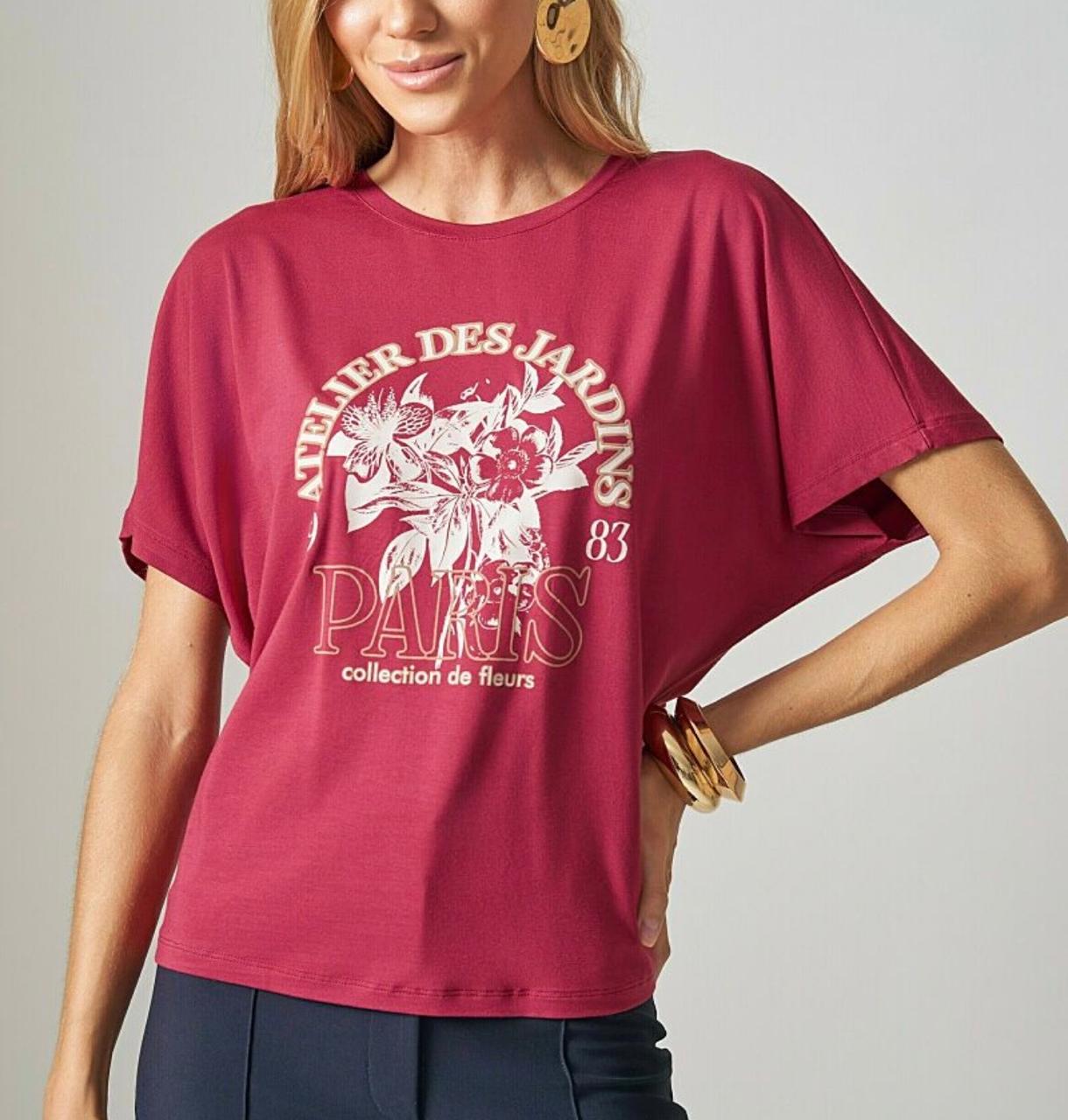 Blusa manga curta estampada ” Atelier des jardins” de viscolycra slim e acabamento feito na galoneira.
