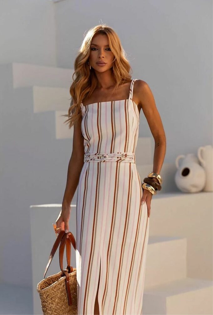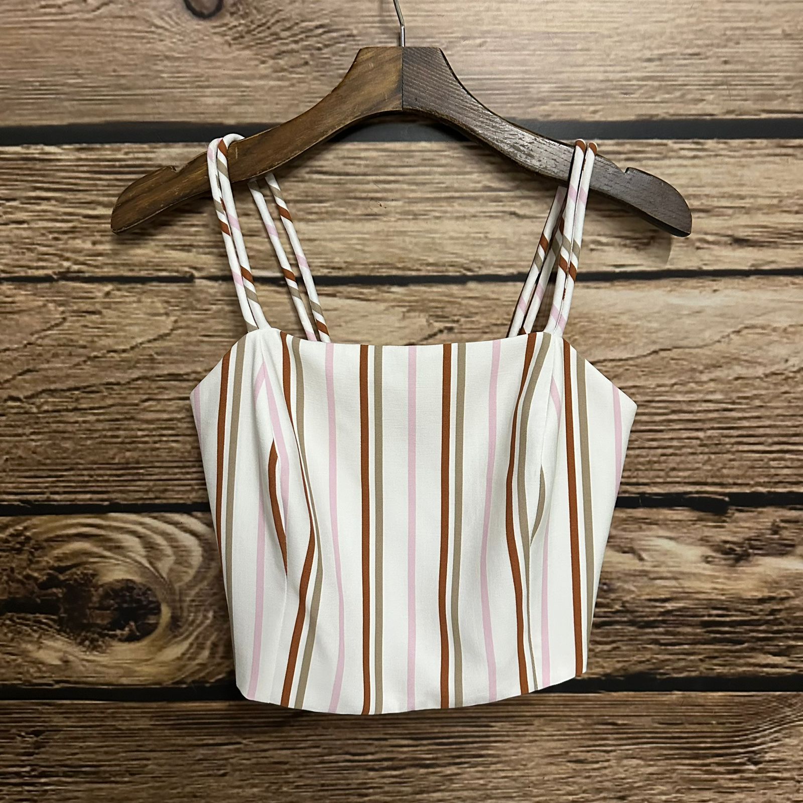 Top com alças duplas com decote reto possuindo elástico nas costas, acompanha o cinto com corda dupla.