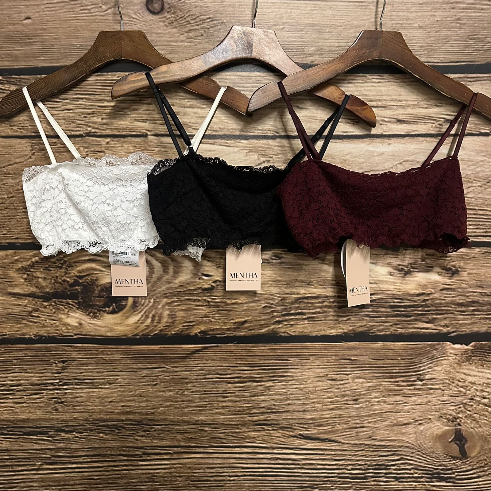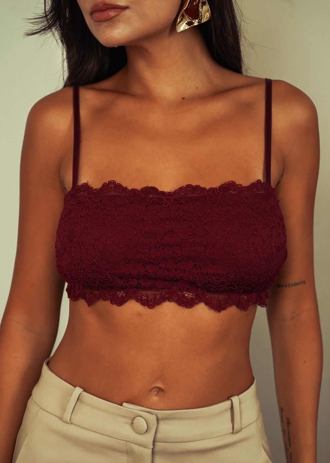 Top faixa em renda com elastano. Possui regulador na alça em elástico e forro de malha no busto.