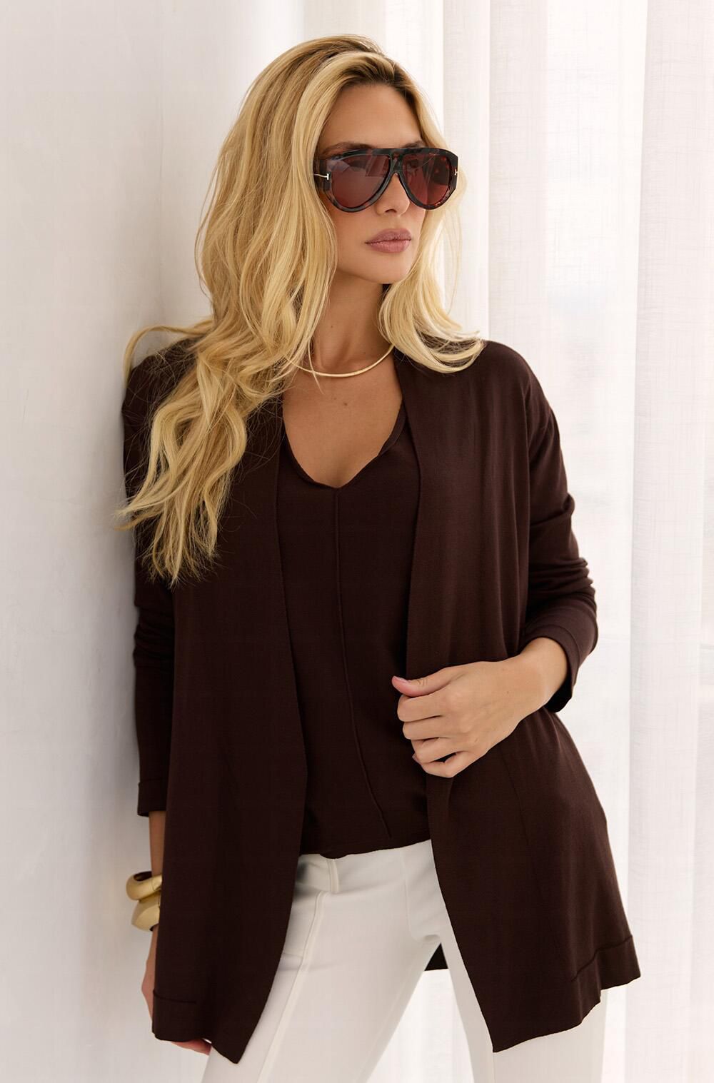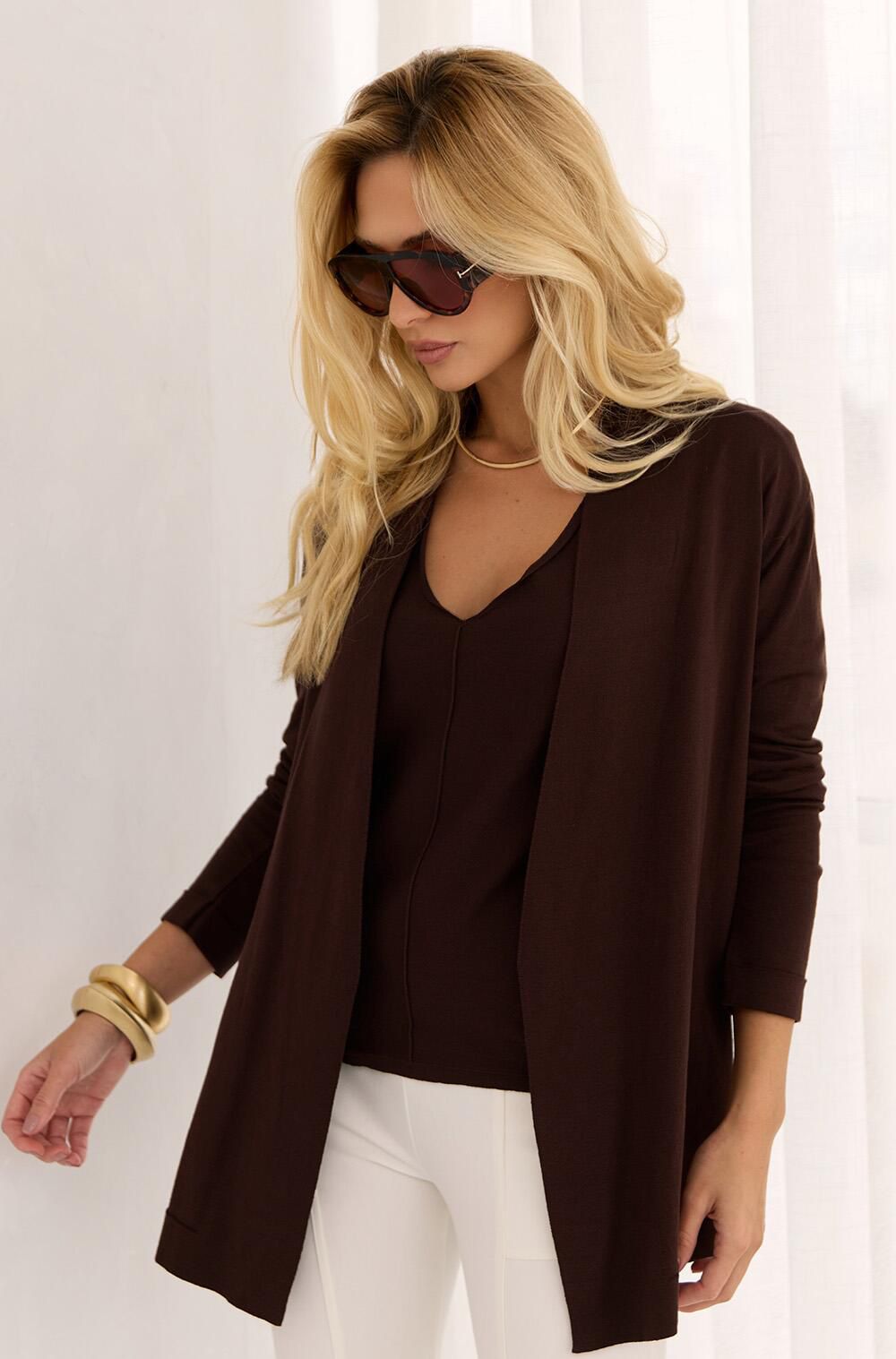 Casaco em Tricot fio 70% viscose 30% poliamida.