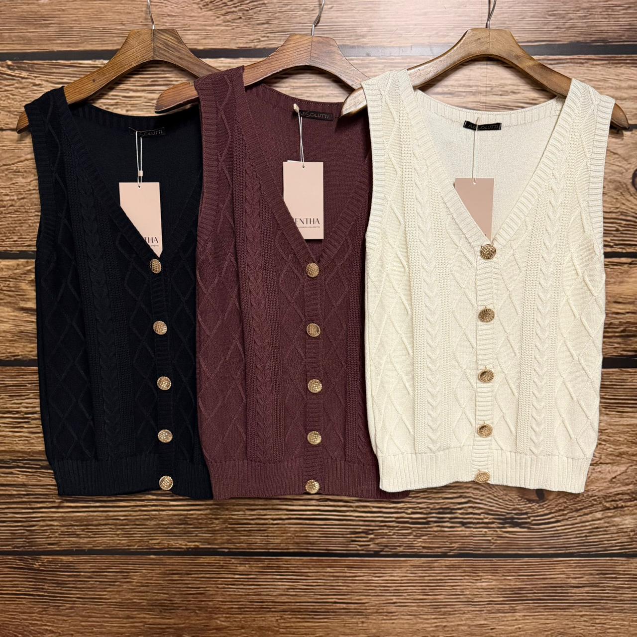 Colete em Tricot fio 70% viscose 30% poliamida.