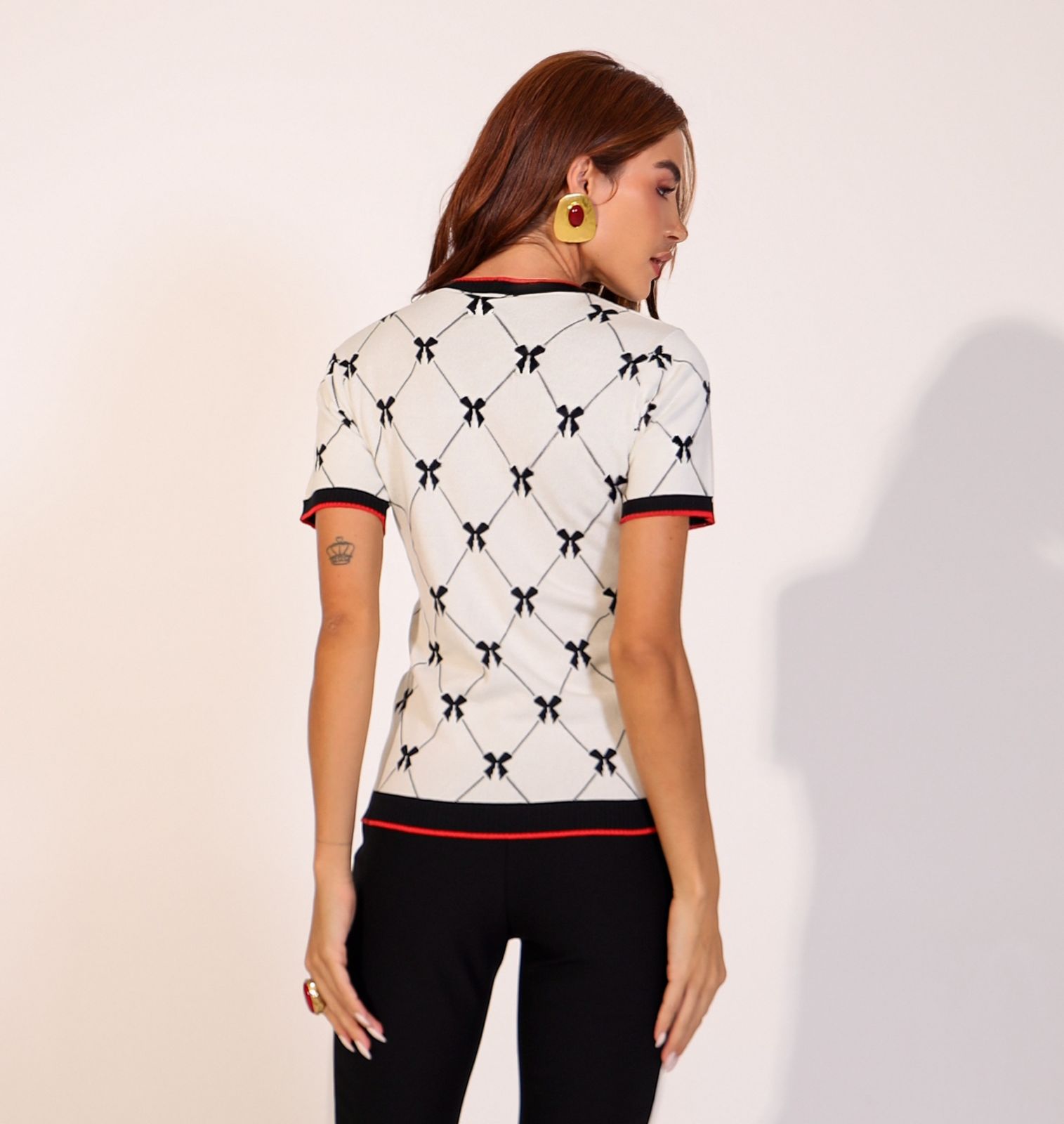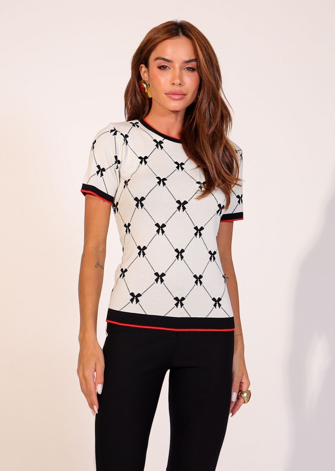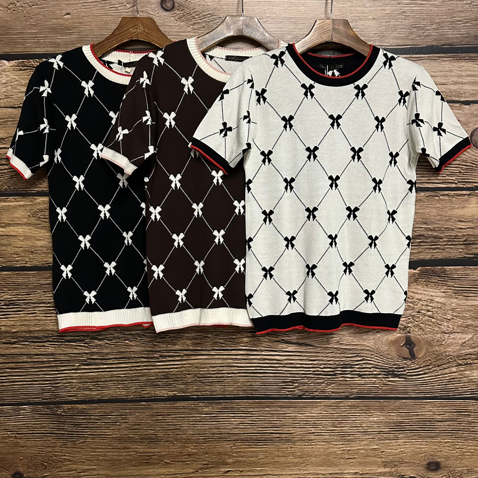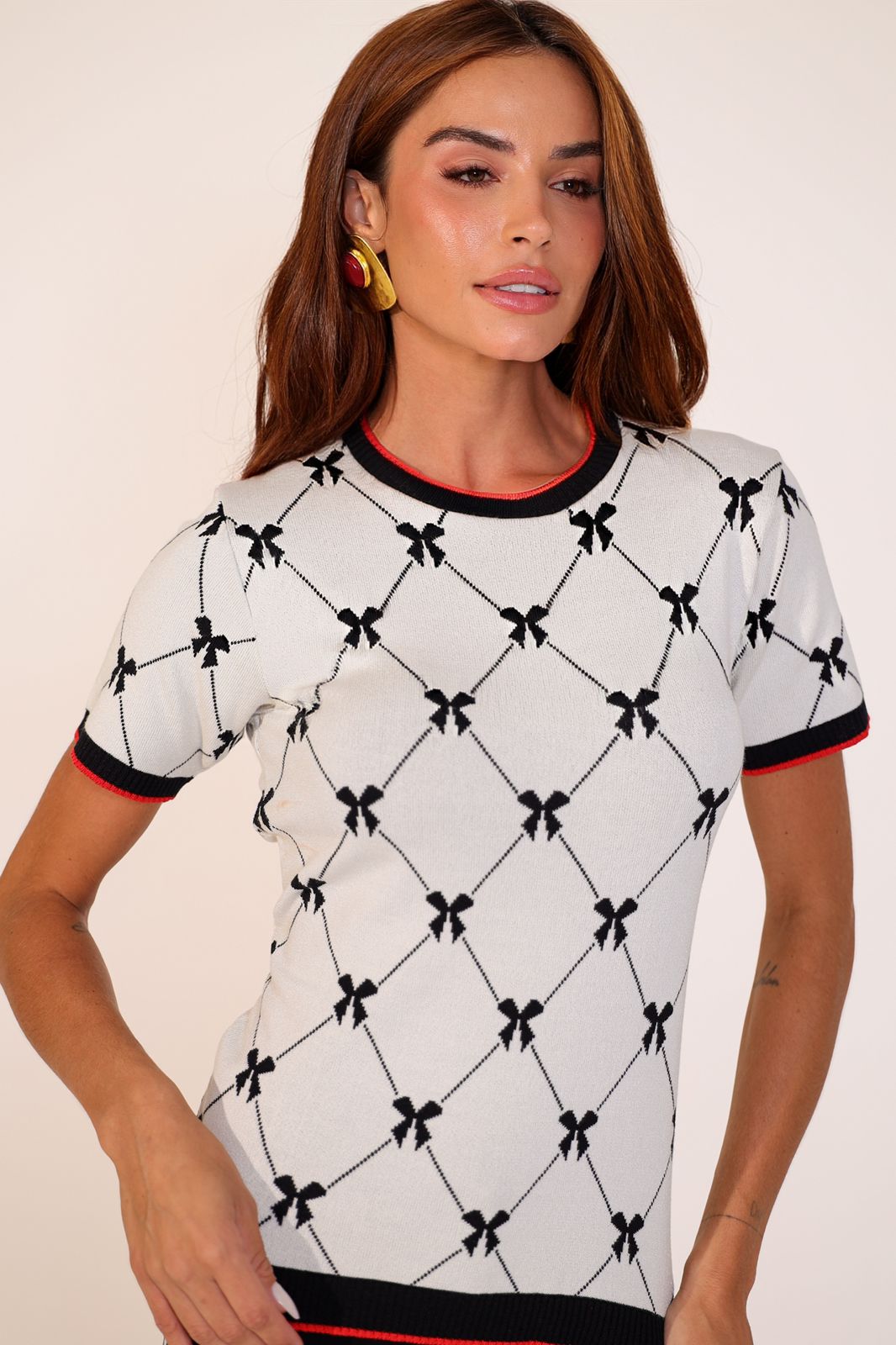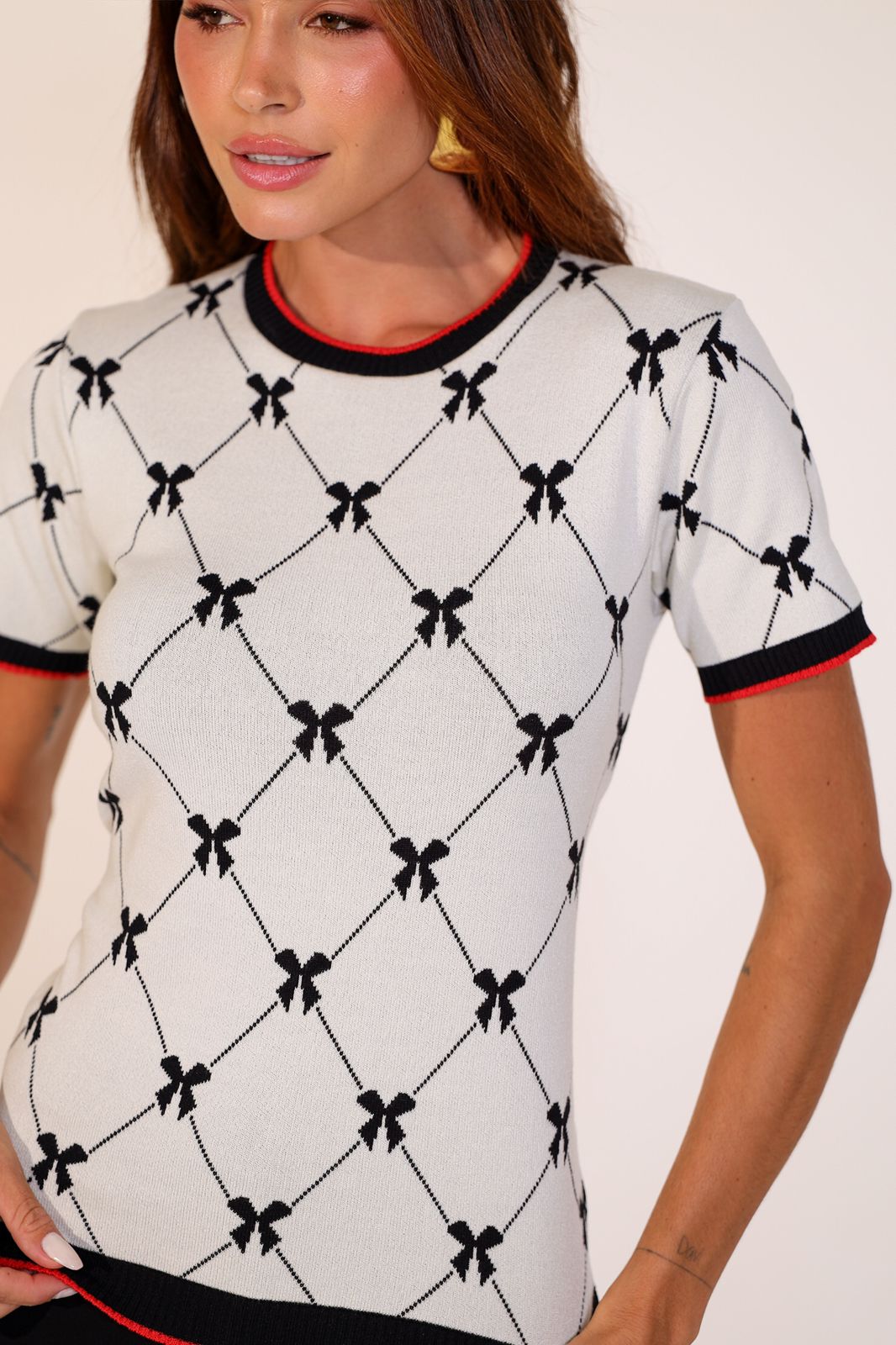 Blusa em Tricot fio 70% viscose 30% poliamida. Decote redondo. Manga curta. Canelado barra, manga e decote.