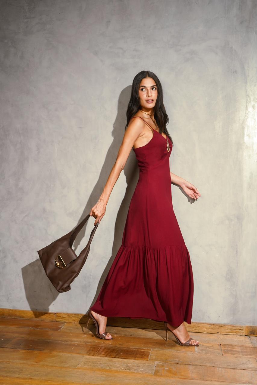 Vestido longo em alfaiataria leve com textura de linho. Possui aviamento de metal no decote com franzido localizado, alças reguláveis, zíper de nylon lateral e forro.