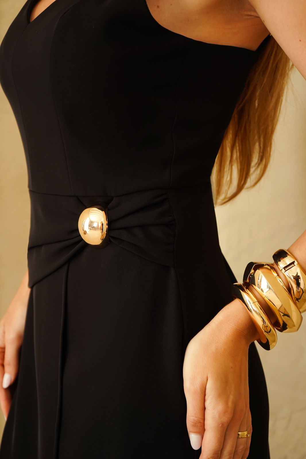 Vestido curto em alfaiataria leve com elastano. Possui decote em V, alças reguláveis, camada sobreposta com aviamento de metal, fechamento nas costas em zíper de nylon.