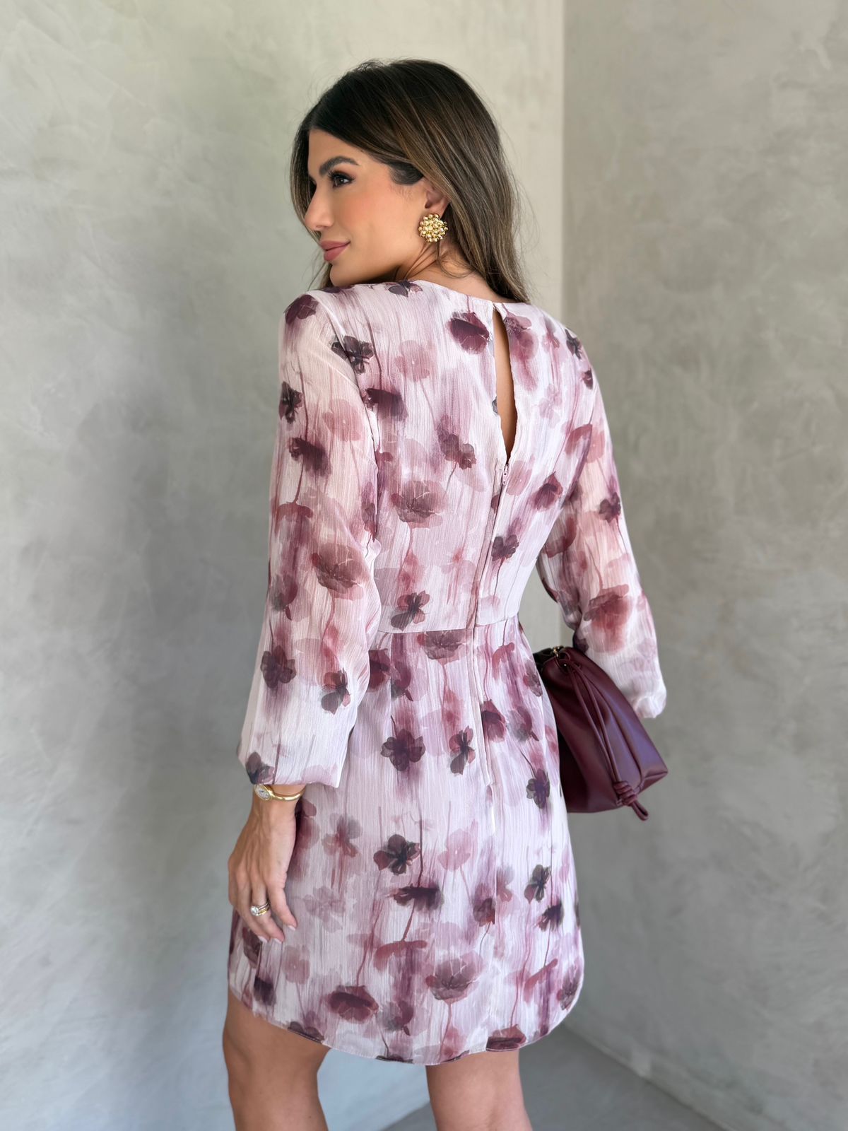 Vestido em yoryu floral exclusivo. Possui decote em V com botão interno no decote, franzido na cintura, elástico no punho, saia transpassada, fechamento em botão, zíper de nylon nas costas e forro.