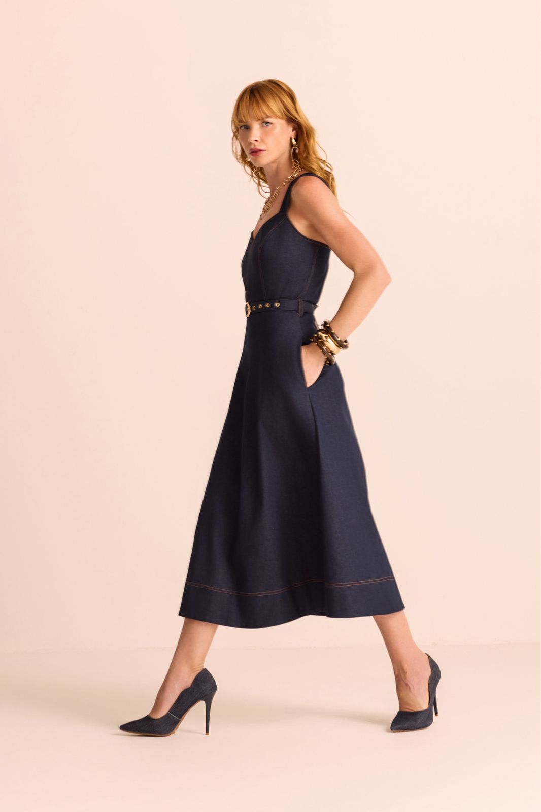 Vestido Jeans Midi Pesponto Cinto